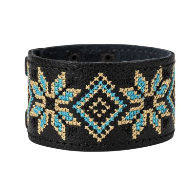 Браслет "Вишивка" (40 мм, чорний, №06)Представляємо елегантний та стильний браслет "Вишивка", що поєднує в собі красу традиційних українських мотивів та сучасний дизайн. Цей аксесуар стане чудовим доповненням до вашого образу, додаючи йому унікальності та національного колориту. Браслет виготовлений з натуральної шкіри, що гарантує його високу якість, довговічність та комфортне носіння. Основа прикрашена яскравою та чіткою машинною вишивкою, виконаною з особливою увагою до деталей, що відтворює багаті орнаменти української вишивки. Кожен візерунок несе в собі глибокий символізм, роблячи браслет не просто прикрасою, а справжнім оберегом. Завдяки зручній застібці на кнопках, браслет легко одягається та надійно фіксується на зап'ясті. Ми подбали про те, щоб ви могли підібрати ідеальний розмір: браслет має кілька положень для регулювання обхвату. Цей браслет – ідеальний вибір для тих, хто цінує якість та бажає підкреслити свою індивідуальність. Він чудово поєднується як з повсякденним одягом, так і з більш вишуканим вбранням в етно-стилі. Характеристики: