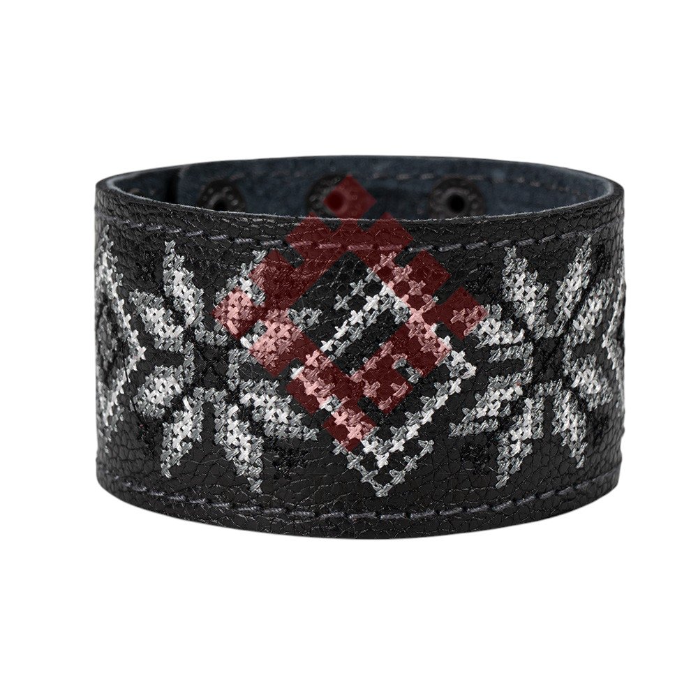 Браслет "Вишивка" (40 мм, чорний, №07)Представляємо елегантний та стильний браслет "Вишивка", що поєднує в собі красу традиційних українських мотивів та сучасний дизайн. Цей аксесуар стане чудовим доповненням до вашого образу, додаючи йому унікальності та національного колориту. Браслет виготовлений з натуральної шкіри, що гарантує його високу якість, довговічність та комфортне носіння. Основа прикрашена яскравою та чіткою машинною вишивкою, виконаною з особливою увагою до деталей, що відтворює багаті орнаменти української вишивки. Кожен візерунок несе в собі глибокий символізм, роблячи браслет не просто прикрасою, а справжнім оберегом. Завдяки зручній застібці на кнопках, браслет легко одягається та надійно фіксується на зап'ясті. Ми подбали про те, щоб ви могли підібрати ідеальний розмір: браслет має кілька положень для регулювання обхвату. Цей браслет – ідеальний вибір для тих, хто цінує якість та бажає підкреслити свою індивідуальність. Він чудово поєднується як з повсякденним одягом, так і з більш вишуканим вбранням в етно-стилі. Характеристики: