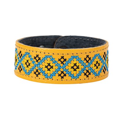 Браслет малий "Вишивка" (25 мм, жовтий, №01)Представляємо елегантний та стильний браслет "Вишивка", що поєднує в собі красу традиційних українських мотивів та сучасний дизайн. Цей аксесуар стане чудовим доповненням до вашого образу, додаючи йому унікальності та національного колориту. Браслет виготовлений з натуральної шкіри, що гарантує його високу якість, довговічність та комфортне носіння. Основа прикрашена яскравою та чіткою машинною вишивкою, виконаною з особливою увагою до деталей, що відтворює багаті орнаменти української вишивки. Кожен візерунок несе в собі глибокий символізм, роблячи браслет не просто прикрасою, а справжнім оберегом. Завдяки зручній застібці на кнопках, браслет легко одягається та надійно фіксується на зап'ясті. Ми подбали про те, щоб ви могли підібрати ідеальний розмір: браслет має кілька положень для регулювання обхвату. Цей браслет – ідеальний вибір для тих, хто цінує якість та бажає підкреслити свою індивідуальність. Він чудово поєднується як з повсякденним одягом, так і з більш вишуканим вбранням в етно-стилі. Характеристики: