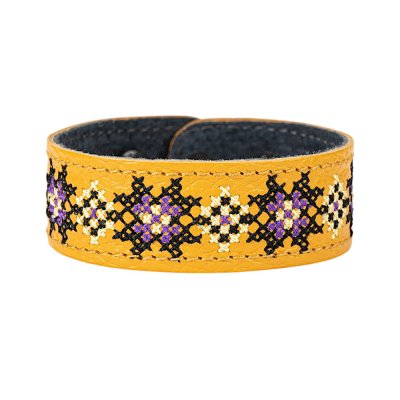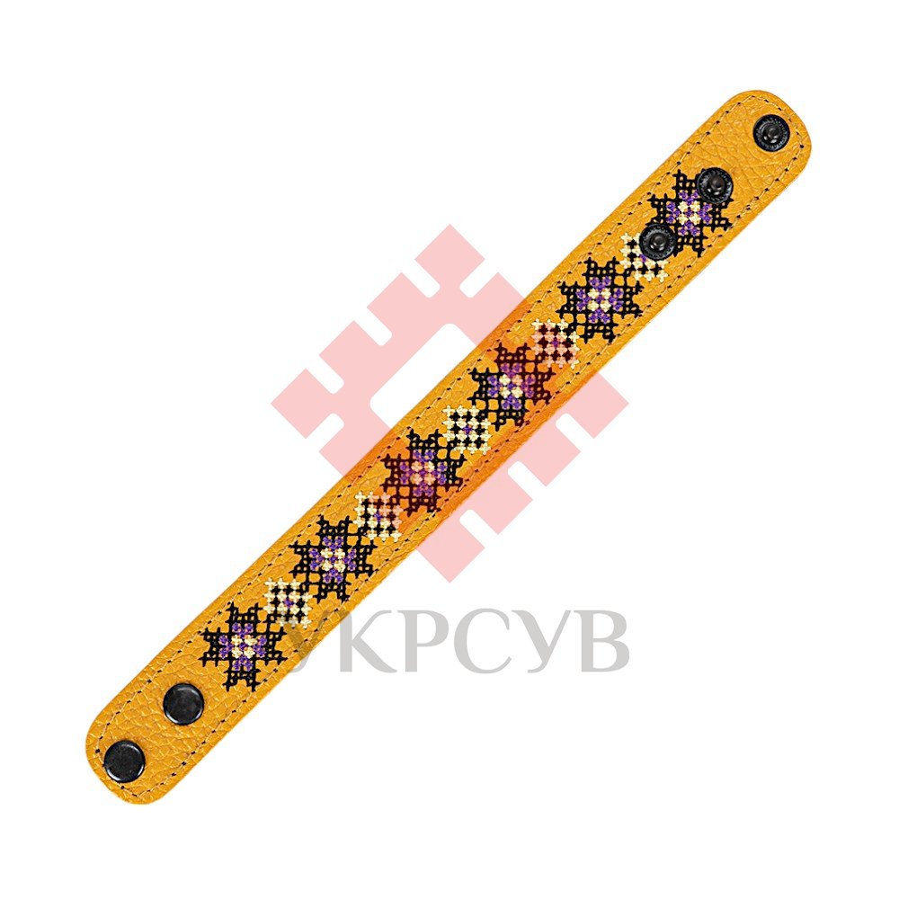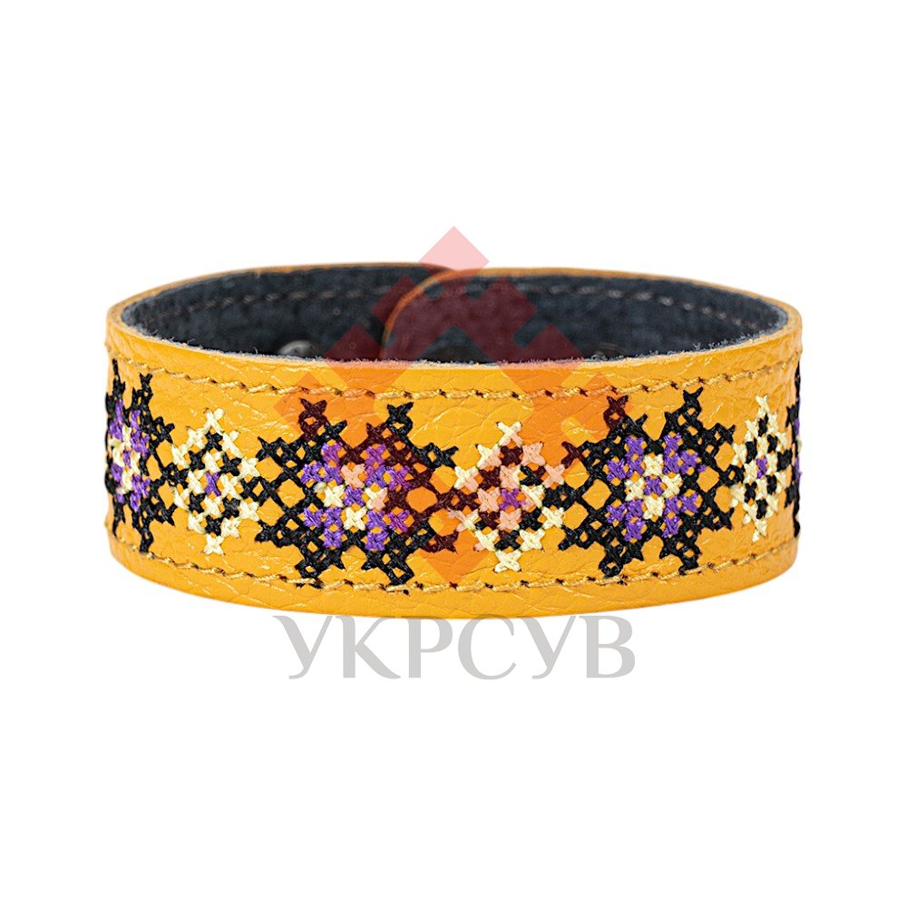 Браслет малий "Вишивка" (25 мм, жовтий, №04)Представляємо елегантний та стильний браслет "Вишивка", що поєднує в собі красу традиційних українських мотивів та сучасний дизайн. Цей аксесуар стане чудовим доповненням до вашого образу, додаючи йому унікальності та національного колориту. Браслет виготовлений з натуральної шкіри, що гарантує його високу якість, довговічність та комфортне носіння. Основа прикрашена яскравою та чіткою машинною вишивкою, виконаною з особливою увагою до деталей, що відтворює багаті орнаменти української вишивки. Кожен візерунок несе в собі глибокий символізм, роблячи браслет не просто прикрасою, а справжнім оберегом. Завдяки зручній застібці на кнопках, браслет легко одягається та надійно фіксується на зап'ясті. Ми подбали про те, щоб ви могли підібрати ідеальний розмір: браслет має кілька положень для регулювання обхвату. Цей браслет – ідеальний вибір для тих, хто цінує якість та бажає підкреслити свою індивідуальність. Він чудово поєднується як з повсякденним одягом, так і з більш вишуканим вбранням в етно-стилі. Характеристики: