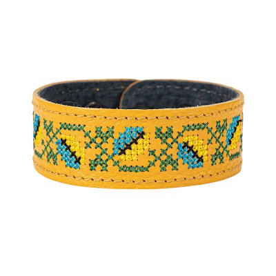 Браслет малий "Вишивка" (25 мм, жовтий, №10)Представляємо елегантний та стильний браслет "Вишивка", що поєднує в собі красу традиційних українських мотивів та сучасний дизайн. Цей аксесуар стане чудовим доповненням до вашого образу, додаючи йому унікальності та національного колориту. Браслет виготовлений з натуральної шкіри, що гарантує його високу якість, довговічність та комфортне носіння. Основа прикрашена яскравою та чіткою машинною вишивкою, виконаною з особливою увагою до деталей, що відтворює багаті орнаменти української вишивки. Кожен візерунок несе в собі глибокий символізм, роблячи браслет не просто прикрасою, а справжнім оберегом. Завдяки зручній застібці на кнопках, браслет легко одягається та надійно фіксується на зап'ясті. Ми подбали про те, щоб ви могли підібрати ідеальний розмір: браслет має кілька положень для регулювання обхвату. Цей браслет – ідеальний вибір для тих, хто цінує якість та бажає підкреслити свою індивідуальність. Він чудово поєднується як з повсякденним одягом, так і з більш вишуканим вбранням в етно-стилі. Характеристики:
