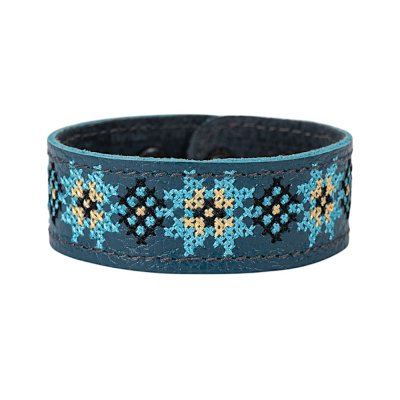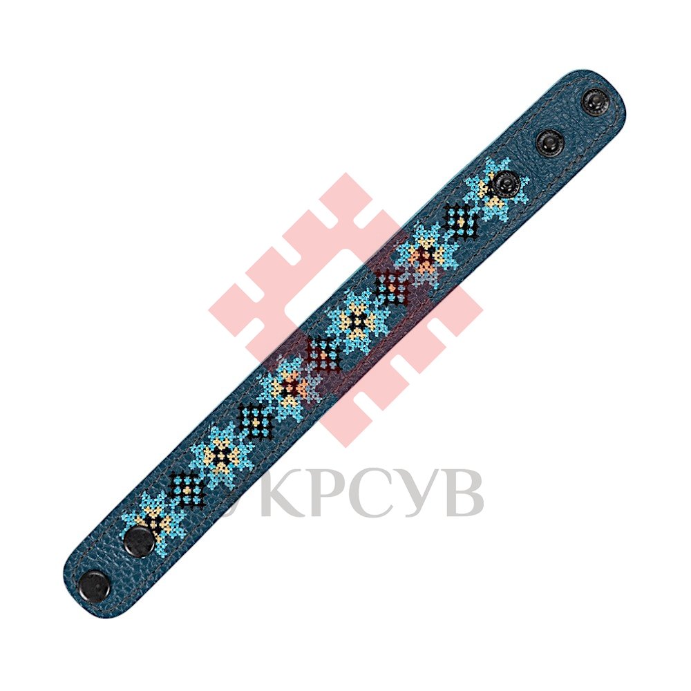 Браслет малий "Вишивка" (25 мм, синій, №04)Представляємо елегантний та стильний браслет "Вишивка", що поєднує в собі красу традиційних українських мотивів та сучасний дизайн. Цей аксесуар стане чудовим доповненням до вашого образу, додаючи йому унікальності та національного колориту. Браслет виготовлений з натуральної шкіри, що гарантує його високу якість, довговічність та комфортне носіння. Основа прикрашена яскравою та чіткою машинною вишивкою, виконаною з особливою увагою до деталей, що відтворює багаті орнаменти української вишивки. Кожен візерунок несе в собі глибокий символізм, роблячи браслет не просто прикрасою, а справжнім оберегом. Завдяки зручній застібці на кнопках, браслет легко одягається та надійно фіксується на зап'ясті. Ми подбали про те, щоб ви могли підібрати ідеальний розмір: браслет має кілька положень для регулювання обхвату. Цей браслет – ідеальний вибір для тих, хто цінує якість та бажає підкреслити свою індивідуальність. Він чудово поєднується як з повсякденним одягом, так і з більш вишуканим вбранням в етно-стилі. Характеристики: