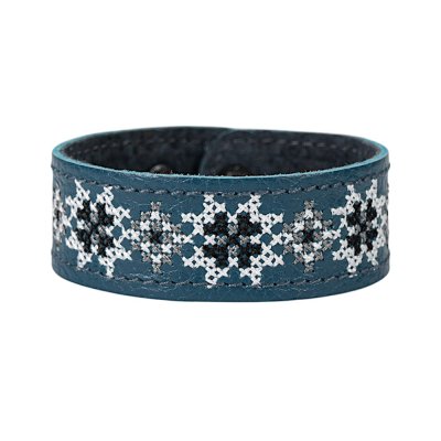 Браслет малий "Вишивка" (25 мм, синій, №05)Представляємо елегантний та стильний браслет "Вишивка", що поєднує в собі красу традиційних українських мотивів та сучасний дизайн. Цей аксесуар стане чудовим доповненням до вашого образу, додаючи йому унікальності та національного колориту. Браслет виготовлений з натуральної шкіри, що гарантує його високу якість, довговічність та комфортне носіння. Основа прикрашена яскравою та чіткою машинною вишивкою, виконаною з особливою увагою до деталей, що відтворює багаті орнаменти української вишивки. Кожен візерунок несе в собі глибокий символізм, роблячи браслет не просто прикрасою, а справжнім оберегом. Завдяки зручній застібці на кнопках, браслет легко одягається та надійно фіксується на зап'ясті. Ми подбали про те, щоб ви могли підібрати ідеальний розмір: браслет має кілька положень для регулювання обхвату. Цей браслет – ідеальний вибір для тих, хто цінує якість та бажає підкреслити свою індивідуальність. Він чудово поєднується як з повсякденним одягом, так і з більш вишуканим вбранням в етно-стилі. Характеристики:
