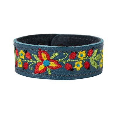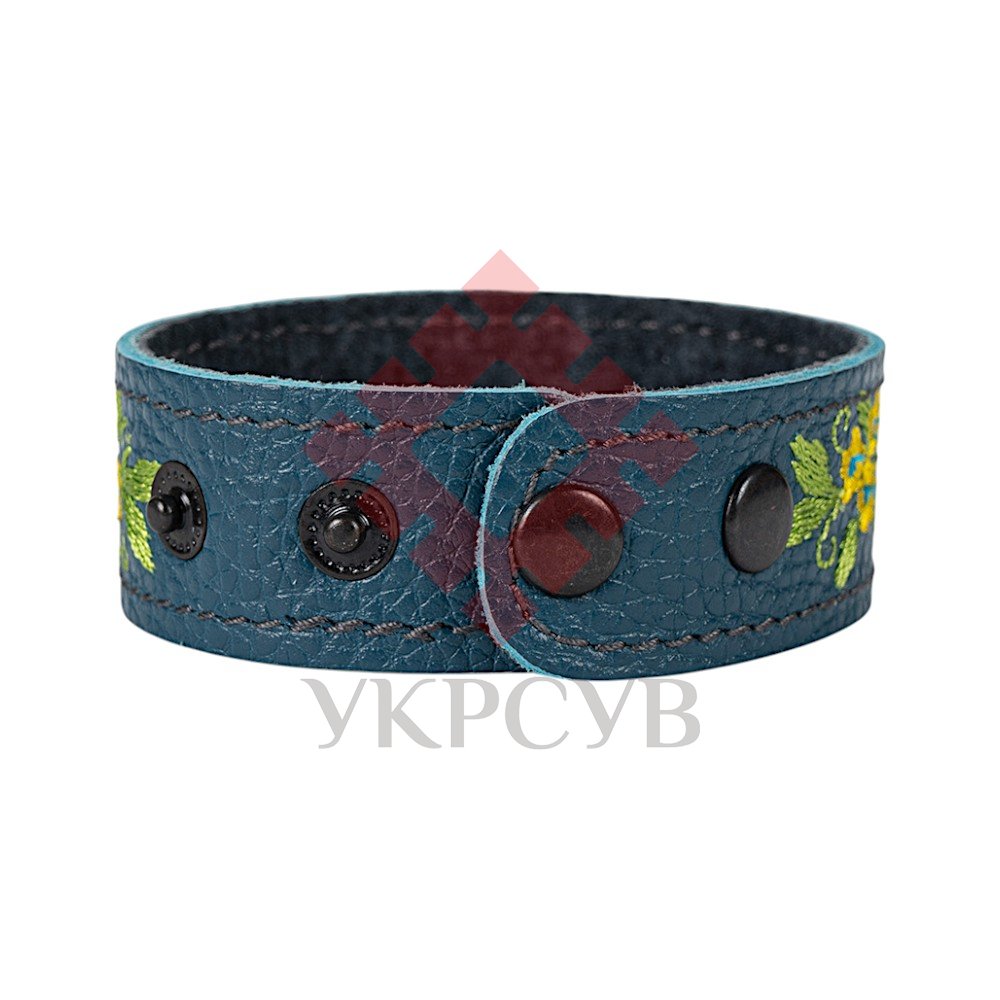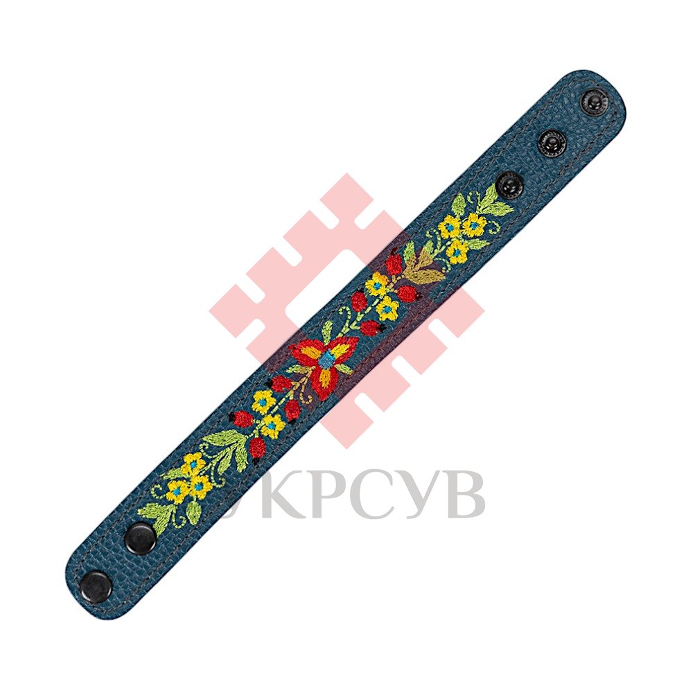 Браслет малий "Вишивка" (25 мм, синій, №06)Представляємо елегантний та стильний браслет "Вишивка", що поєднує в собі красу традиційних українських мотивів та сучасний дизайн. Цей аксесуар стане чудовим доповненням до вашого образу, додаючи йому унікальності та національного колориту. Браслет виготовлений з натуральної шкіри, що гарантує його високу якість, довговічність та комфортне носіння. Основа прикрашена яскравою та чіткою машинною вишивкою, виконаною з особливою увагою до деталей, що відтворює багаті орнаменти української вишивки. Кожен візерунок несе в собі глибокий символізм, роблячи браслет не просто прикрасою, а справжнім оберегом. Завдяки зручній застібці на кнопках, браслет легко одягається та надійно фіксується на зап'ясті. Ми подбали про те, щоб ви могли підібрати ідеальний розмір: браслет має кілька положень для регулювання обхвату. Цей браслет – ідеальний вибір для тих, хто цінує якість та бажає підкреслити свою індивідуальність. Він чудово поєднується як з повсякденним одягом, так і з більш вишуканим вбранням в етно-стилі. Характеристики: