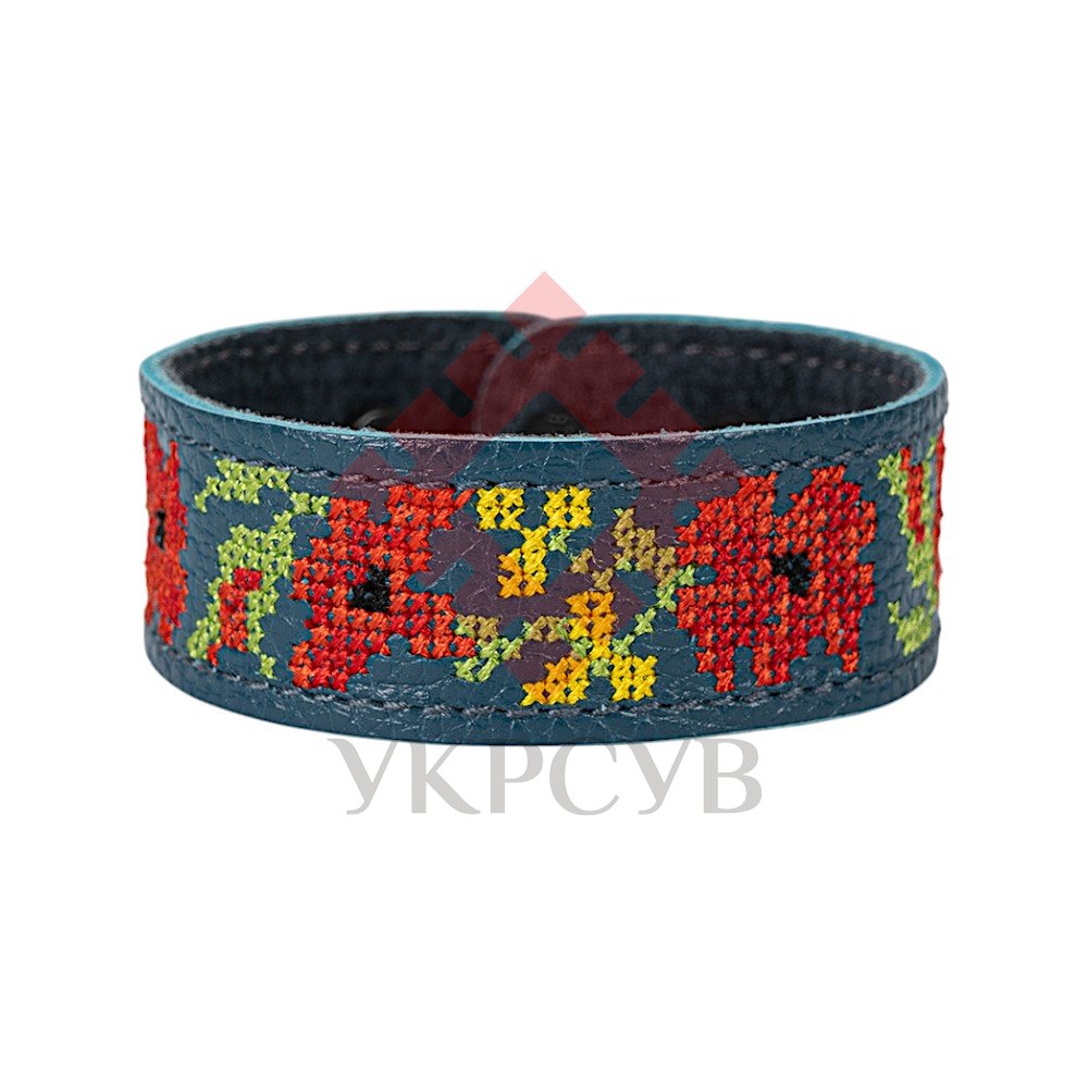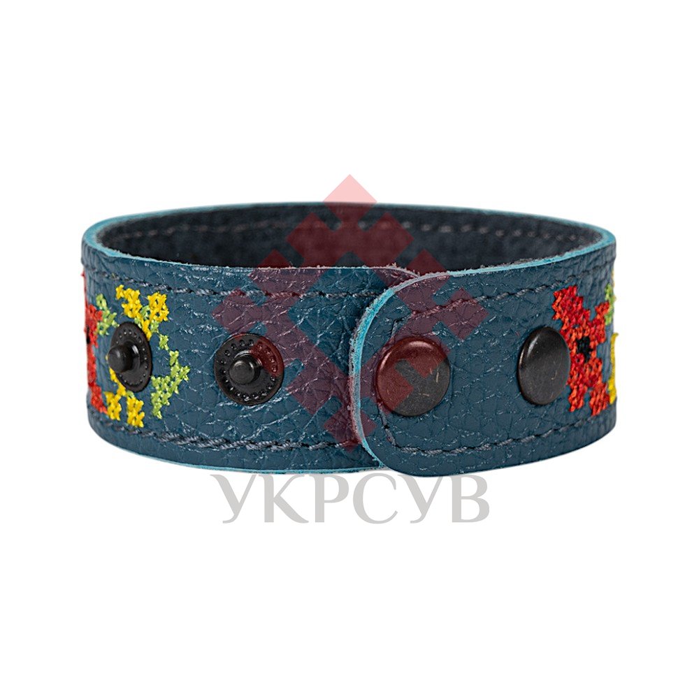 Браслет малий "Вишивка" (25 мм, синій, №08)Представляємо елегантний та стильний браслет "Вишивка", що поєднує в собі красу традиційних українських мотивів та сучасний дизайн. Цей аксесуар стане чудовим доповненням до вашого образу, додаючи йому унікальності та національного колориту. Браслет виготовлений з натуральної шкіри, що гарантує його високу якість, довговічність та комфортне носіння. Основа прикрашена яскравою та чіткою машинною вишивкою, виконаною з особливою увагою до деталей, що відтворює багаті орнаменти української вишивки. Кожен візерунок несе в собі глибокий символізм, роблячи браслет не просто прикрасою, а справжнім оберегом. Завдяки зручній застібці на кнопках, браслет легко одягається та надійно фіксується на зап'ясті. Ми подбали про те, щоб ви могли підібрати ідеальний розмір: браслет має кілька положень для регулювання обхвату. Цей браслет – ідеальний вибір для тих, хто цінує якість та бажає підкреслити свою індивідуальність. Він чудово поєднується як з повсякденним одягом, так і з більш вишуканим вбранням в етно-стилі. Характеристики: