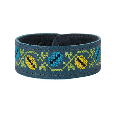 Браслет малий "Вишивка" (25 мм, синій, №10)Представляємо елегантний та стильний браслет "Вишивка", що поєднує в собі красу традиційних українських мотивів та сучасний дизайн. Цей аксесуар стане чудовим доповненням до вашого образу, додаючи йому унікальності та національного колориту. Браслет виготовлений з натуральної шкіри, що гарантує його високу якість, довговічність та комфортне носіння. Основа прикрашена яскравою та чіткою машинною вишивкою, виконаною з особливою увагою до деталей, що відтворює багаті орнаменти української вишивки. Кожен візерунок несе в собі глибокий символізм, роблячи браслет не просто прикрасою, а справжнім оберегом. Завдяки зручній застібці на кнопках, браслет легко одягається та надійно фіксується на зап'ясті. Ми подбали про те, щоб ви могли підібрати ідеальний розмір: браслет має кілька положень для регулювання обхвату. Цей браслет – ідеальний вибір для тих, хто цінує якість та бажає підкреслити свою індивідуальність. Він чудово поєднується як з повсякденним одягом, так і з більш вишуканим вбранням в етно-стилі. Характеристики: