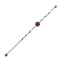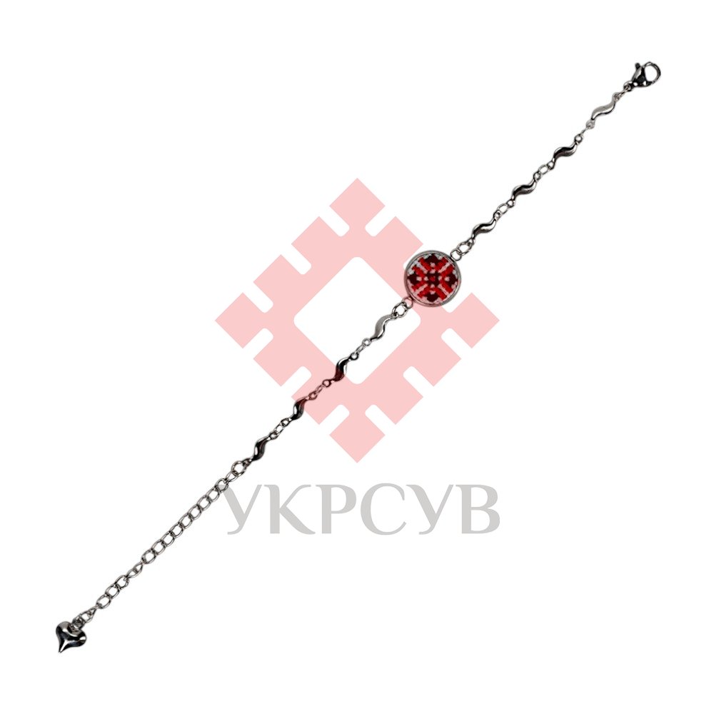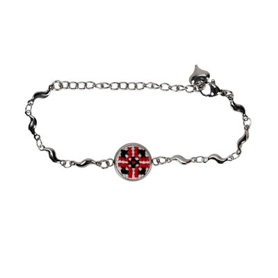 Вишитий браслет (1.2 см) – Орнамент 002Представляємо вишуканий та символічний браслет, що поєднує в собі сучасну елегантність та глибокі традиції української вишивки. Цей аксесуар стане не лише чудовою прикрасою, а й справжнім оберегом, який завжди буде з вами. Браслет має витончений металевий ланцюжок сріблястого кольору, що складається з хвилястих елементів, які додають виробу оригінальності та легкості. У центрі композиції розташований круглий медальйон, що обрамляє мініатюрну ручну вишивку хрестиком. Візерунок виконаний у традиційних червоно-чорних кольорах, що символізують любов, життєву енергію та захист. Завдяки зручній та надійній застібці-карабіну, браслет легко одягається та регулюється по довжині, що дозволяє ідеально підігнати його під розмір вашого зап'ястя. На кінці ланцюжка розташована маленька підвіска-серце, яка додає прикрасі романтичності. Цей браслет – ідеальний вибір для тих, хто цінує унікальні прикраси з національним колоритом. Він чудово доповнить як повсякденний, так і святковий образ, підкреслюючи вашу індивідуальність та любов до української культури. Характеристики: