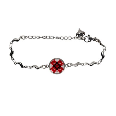 Вишитий браслет (1.2 см) – Орнамент 003Представляємо вишуканий та символічний браслет, що поєднує в собі сучасну елегантність та глибокі традиції української вишивки. Цей аксесуар стане не лише чудовою прикрасою, а й справжнім оберегом, який завжди буде з вами. Браслет має витончений металевий ланцюжок сріблястого кольору, що складається з хвилястих елементів, які додають виробу оригінальності та легкості. У центрі композиції розташований круглий медальйон, що обрамляє мініатюрну ручну вишивку хрестиком. Візерунок виконаний у традиційних червоно-чорних кольорах, що символізують любов, життєву енергію та захист. Завдяки зручній та надійній застібці-карабіну, браслет легко одягається та регулюється по довжині, що дозволяє ідеально підігнати його під розмір вашого зап'ястя. На кінці ланцюжка розташована маленька підвіска-серце, яка додає прикрасі романтичності. Цей браслет – ідеальний вибір для тих, хто цінує унікальні прикраси з національним колоритом. Він чудово доповнить як повсякденний, так і святковий образ, підкреслюючи вашу індивідуальність та любов до української культури. Характеристики: