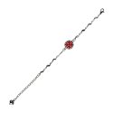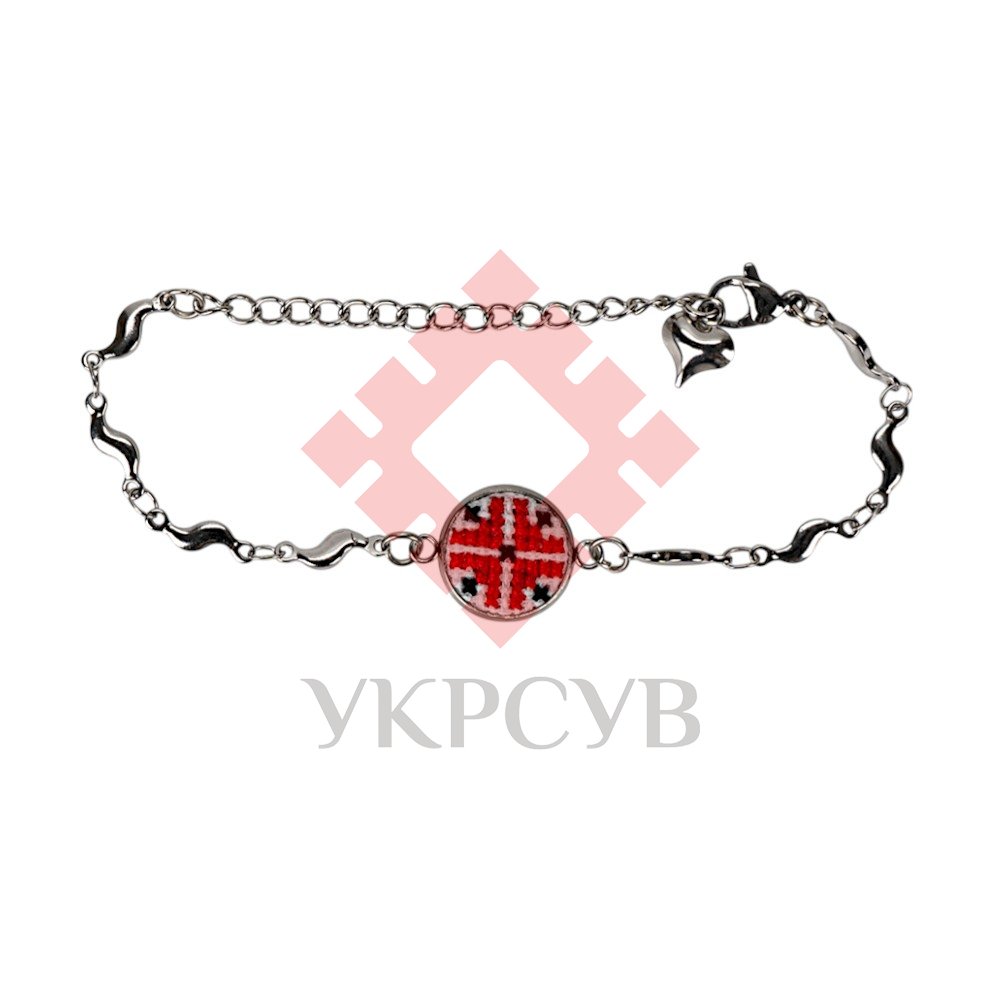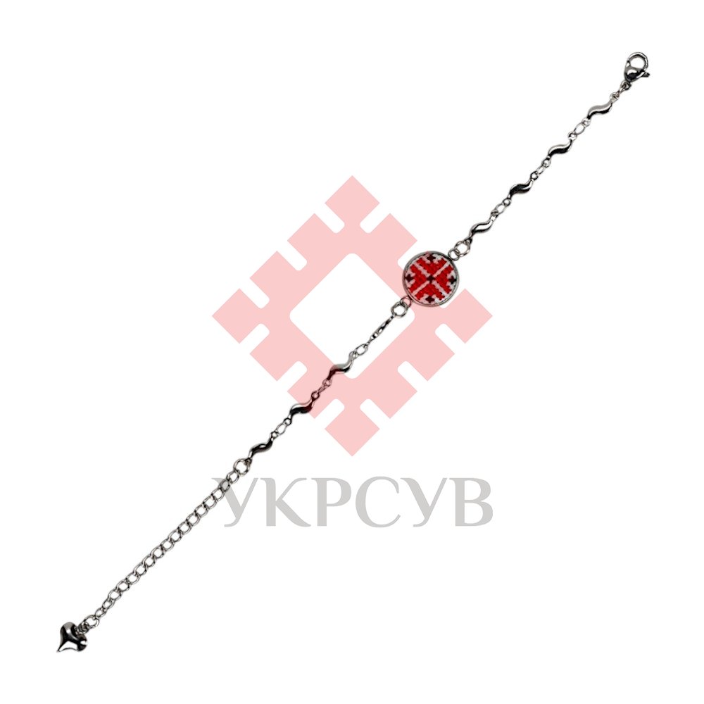Вишитий браслет (1.2 см) – Орнамент 004Представляємо вишуканий та символічний браслет, що поєднує в собі сучасну елегантність та глибокі традиції української вишивки. Цей аксесуар стане не лише чудовою прикрасою, а й справжнім оберегом, який завжди буде з вами. Браслет має витончений металевий ланцюжок сріблястого кольору, що складається з хвилястих елементів, які додають виробу оригінальності та легкості. У центрі композиції розташований круглий медальйон, що обрамляє мініатюрну ручну вишивку хрестиком. Візерунок виконаний у традиційних червоно-чорних кольорах, що символізують любов, життєву енергію та захист. Завдяки зручній та надійній застібці-карабіну, браслет легко одягається та регулюється по довжині, що дозволяє ідеально підігнати його під розмір вашого зап'ястя. На кінці ланцюжка розташована маленька підвіска-серце, яка додає прикрасі романтичності. Цей браслет – ідеальний вибір для тих, хто цінує унікальні прикраси з національним колоритом. Він чудово доповнить як повсякденний, так і святковий образ, підкреслюючи вашу індивідуальність та любов до української культури. Характеристики: