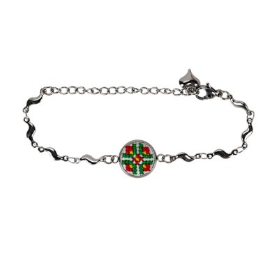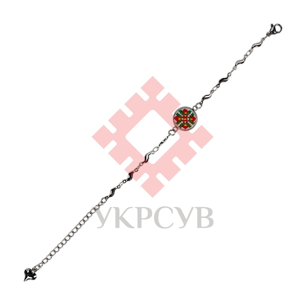 Вишитий браслет (1.2 см) – Орнамент 008Представляємо вишуканий та символічний браслет, що поєднує в собі сучасну елегантність та глибокі традиції української вишивки. Цей аксесуар стане не лише чудовою прикрасою, а й справжнім оберегом, який завжди буде з вами. Браслет має витончений металевий ланцюжок сріблястого кольору, що складається з хвилястих елементів, які додають виробу оригінальності та легкості. У центрі композиції розташований круглий медальйон, що обрамляє мініатюрну ручну вишивку хрестиком. Візерунок виконаний у традиційних червоно-чорних кольорах, що символізують любов, життєву енергію та захист. Завдяки зручній та надійній застібці-карабіну, браслет легко одягається та регулюється по довжині, що дозволяє ідеально підігнати його під розмір вашого зап'ястя. На кінці ланцюжка розташована маленька підвіска-серце, яка додає прикрасі романтичності. Цей браслет – ідеальний вибір для тих, хто цінує унікальні прикраси з національним колоритом. Він чудово доповнить як повсякденний, так і святковий образ, підкреслюючи вашу індивідуальність та любов до української культури. Характеристики: