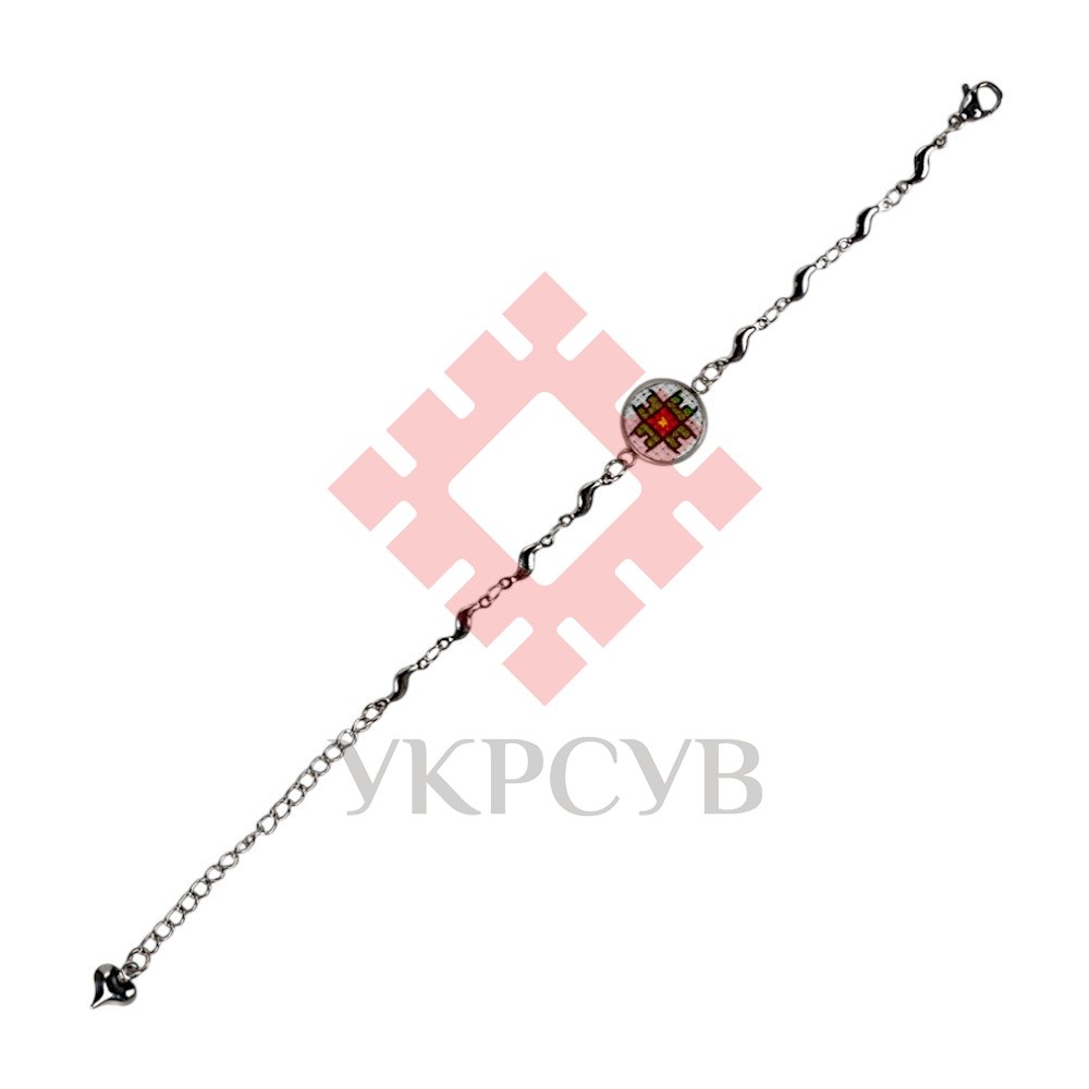 Вишитий браслет (1.2 см) – Орнамент 009Представляємо вишуканий та символічний браслет, що поєднує в собі сучасну елегантність та глибокі традиції української вишивки. Цей аксесуар стане не лише чудовою прикрасою, а й справжнім оберегом, який завжди буде з вами. Браслет має витончений металевий ланцюжок сріблястого кольору, що складається з хвилястих елементів, які додають виробу оригінальності та легкості. У центрі композиції розташований круглий медальйон, що обрамляє мініатюрну ручну вишивку хрестиком. Візерунок виконаний у традиційних червоно-чорних кольорах, що символізують любов, життєву енергію та захист. Завдяки зручній та надійній застібці-карабіну, браслет легко одягається та регулюється по довжині, що дозволяє ідеально підігнати його під розмір вашого зап'ястя. На кінці ланцюжка розташована маленька підвіска-серце, яка додає прикрасі романтичності. Цей браслет – ідеальний вибір для тих, хто цінує унікальні прикраси з національним колоритом. Він чудово доповнить як повсякденний, так і святковий образ, підкреслюючи вашу індивідуальність та любов до української культури. Характеристики: