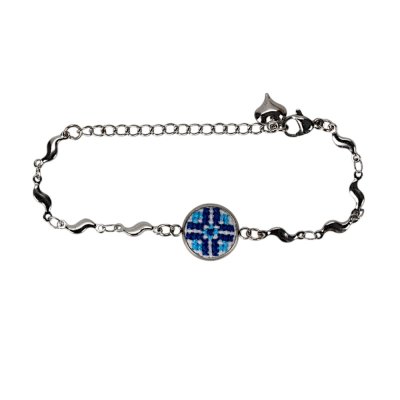 Вишитий браслет (1.2 см) – Орнамент 012Представляємо вишуканий та символічний браслет, що поєднує в собі сучасну елегантність та глибокі традиції української вишивки. Цей аксесуар стане не лише чудовою прикрасою, а й справжнім оберегом, який завжди буде з вами. Браслет має витончений металевий ланцюжок сріблястого кольору, що складається з хвилястих елементів, які додають виробу оригінальності та легкості. У центрі композиції розташований круглий медальйон, що обрамляє мініатюрну ручну вишивку хрестиком. Візерунок виконаний у традиційних червоно-чорних кольорах, що символізують любов, життєву енергію та захист. Завдяки зручній та надійній застібці-карабіну, браслет легко одягається та регулюється по довжині, що дозволяє ідеально підігнати його під розмір вашого зап'ястя. На кінці ланцюжка розташована маленька підвіска-серце, яка додає прикрасі романтичності. Цей браслет – ідеальний вибір для тих, хто цінує унікальні прикраси з національним колоритом. Він чудово доповнить як повсякденний, так і святковий образ, підкреслюючи вашу індивідуальність та любов до української культури. Характеристики: