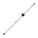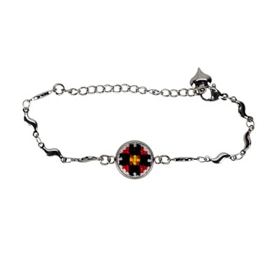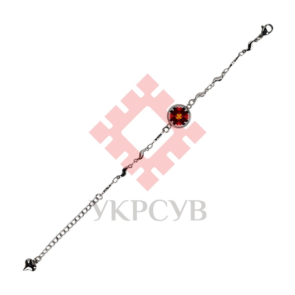 Вишитий браслет (1.2 см) – Орнамент 013Представляємо вишуканий та символічний браслет, що поєднує в собі сучасну елегантність та глибокі традиції української вишивки. Цей аксесуар стане не лише чудовою прикрасою, а й справжнім оберегом, який завжди буде з вами. Браслет має витончений металевий ланцюжок сріблястого кольору, що складається з хвилястих елементів, які додають виробу оригінальності та легкості. У центрі композиції розташований круглий медальйон, що обрамляє мініатюрну ручну вишивку хрестиком. Візерунок виконаний у традиційних червоно-чорних кольорах, що символізують любов, життєву енергію та захист. Завдяки зручній та надійній застібці-карабіну, браслет легко одягається та регулюється по довжині, що дозволяє ідеально підігнати його під розмір вашого зап'ястя. На кінці ланцюжка розташована маленька підвіска-серце, яка додає прикрасі романтичності. Цей браслет – ідеальний вибір для тих, хто цінує унікальні прикраси з національним колоритом. Він чудово доповнить як повсякденний, так і святковий образ, підкреслюючи вашу індивідуальність та любов до української культури. Характеристики: