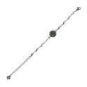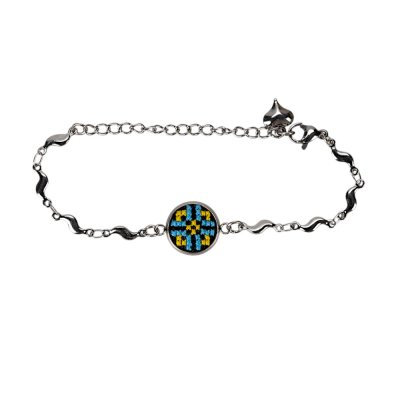 Вишитий браслет (1.2 см) – Орнамент 014Представляємо вишуканий та символічний браслет, що поєднує в собі сучасну елегантність та глибокі традиції української вишивки. Цей аксесуар стане не лише чудовою прикрасою, а й справжнім оберегом, який завжди буде з вами. Браслет має витончений металевий ланцюжок сріблястого кольору, що складається з хвилястих елементів, які додають виробу оригінальності та легкості. У центрі композиції розташований круглий медальйон, що обрамляє мініатюрну ручну вишивку хрестиком. Візерунок виконаний у традиційних червоно-чорних кольорах, що символізують любов, життєву енергію та захист. Завдяки зручній та надійній застібці-карабіну, браслет легко одягається та регулюється по довжині, що дозволяє ідеально підігнати його під розмір вашого зап'ястя. На кінці ланцюжка розташована маленька підвіска-серце, яка додає прикрасі романтичності. Цей браслет – ідеальний вибір для тих, хто цінує унікальні прикраси з національним колоритом. Він чудово доповнить як повсякденний, так і святковий образ, підкреслюючи вашу індивідуальність та любов до української культури. Характеристики: