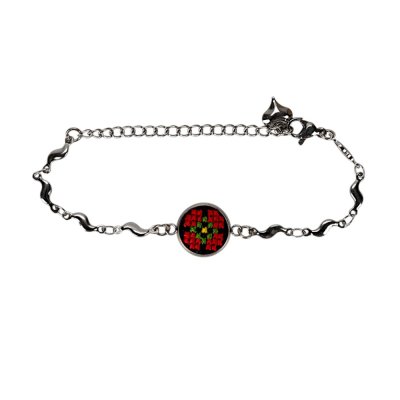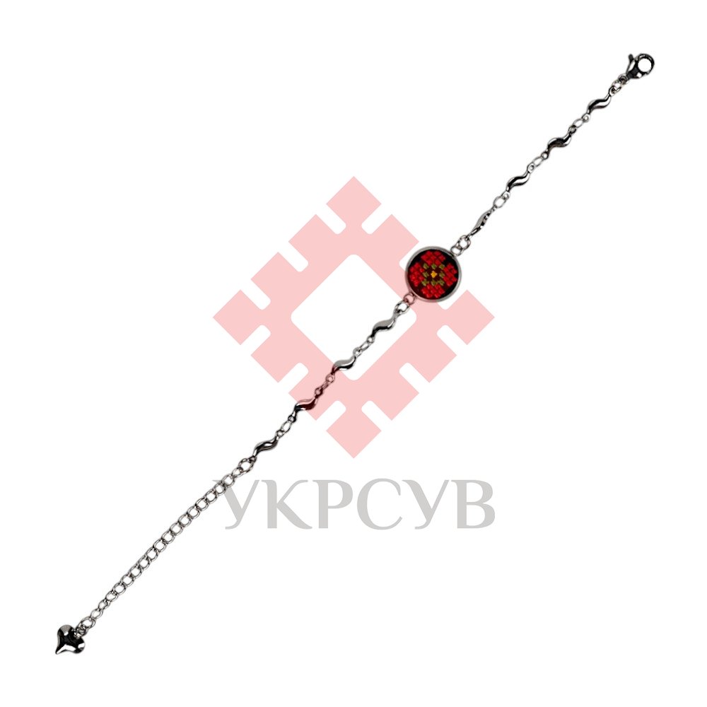 Вишитий браслет (1.2 см) – Орнамент 016Представляємо вишуканий та символічний браслет, що поєднує в собі сучасну елегантність та глибокі традиції української вишивки. Цей аксесуар стане не лише чудовою прикрасою, а й справжнім оберегом, який завжди буде з вами. Браслет має витончений металевий ланцюжок сріблястого кольору, що складається з хвилястих елементів, які додають виробу оригінальності та легкості. У центрі композиції розташований круглий медальйон, що обрамляє мініатюрну ручну вишивку хрестиком. Візерунок виконаний у традиційних червоно-чорних кольорах, що символізують любов, життєву енергію та захист. Завдяки зручній та надійній застібці-карабіну, браслет легко одягається та регулюється по довжині, що дозволяє ідеально підігнати його під розмір вашого зап'ястя. На кінці ланцюжка розташована маленька підвіска-серце, яка додає прикрасі романтичності. Цей браслет – ідеальний вибір для тих, хто цінує унікальні прикраси з національним колоритом. Він чудово доповнить як повсякденний, так і святковий образ, підкреслюючи вашу індивідуальність та любов до української культури. Характеристики: