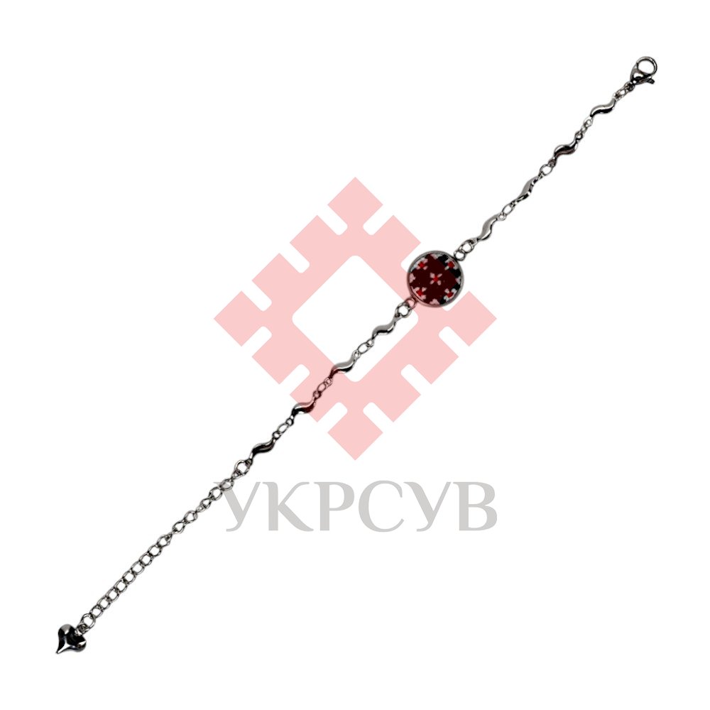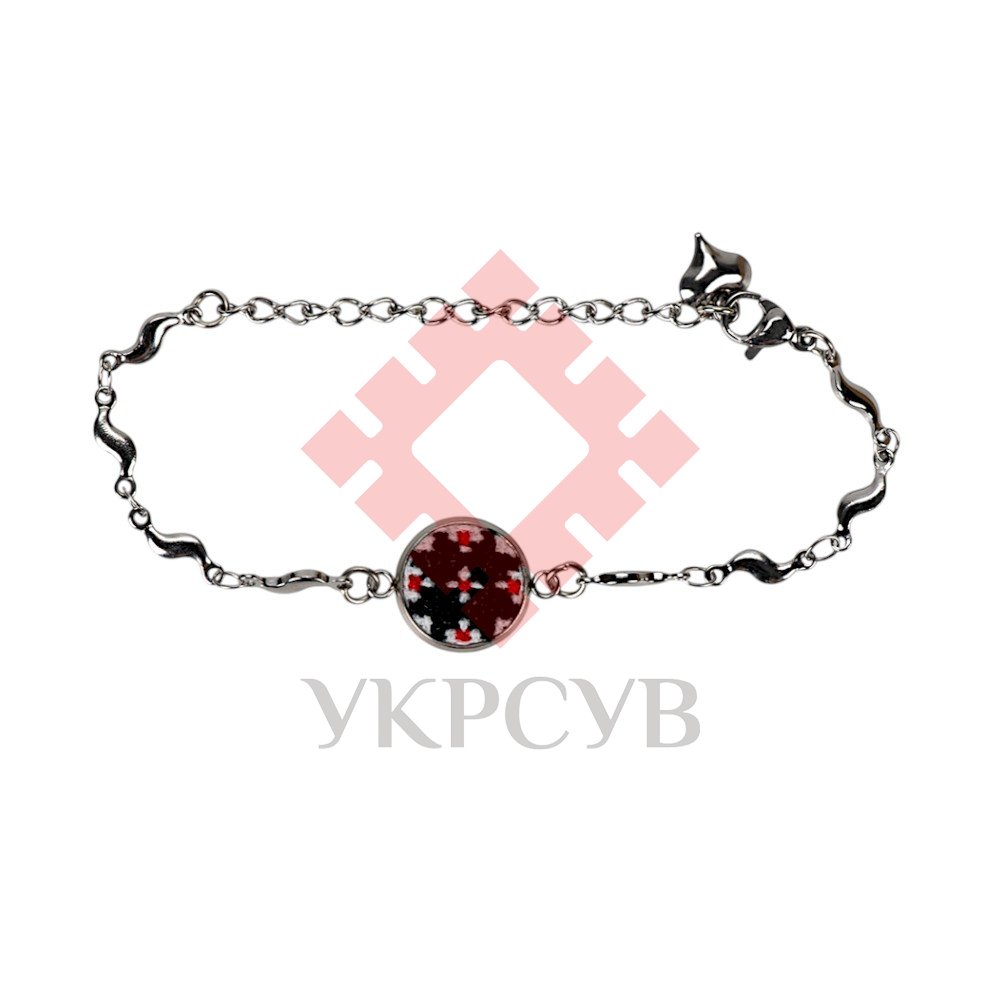 Вишитий браслет (1.2 см) – Орнамент 019Представляємо вишуканий та символічний браслет, що поєднує в собі сучасну елегантність та глибокі традиції української вишивки. Цей аксесуар стане не лише чудовою прикрасою, а й справжнім оберегом, який завжди буде з вами. Браслет має витончений металевий ланцюжок сріблястого кольору, що складається з хвилястих елементів, які додають виробу оригінальності та легкості. У центрі композиції розташований круглий медальйон, що обрамляє мініатюрну ручну вишивку хрестиком. Візерунок виконаний у традиційних червоно-чорних кольорах, що символізують любов, життєву енергію та захист. Завдяки зручній та надійній застібці-карабіну, браслет легко одягається та регулюється по довжині, що дозволяє ідеально підігнати його під розмір вашого зап'ястя. На кінці ланцюжка розташована маленька підвіска-серце, яка додає прикрасі романтичності. Цей браслет – ідеальний вибір для тих, хто цінує унікальні прикраси з національним колоритом. Він чудово доповнить як повсякденний, так і святковий образ, підкреслюючи вашу індивідуальність та любов до української культури. Характеристики: