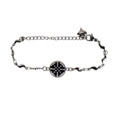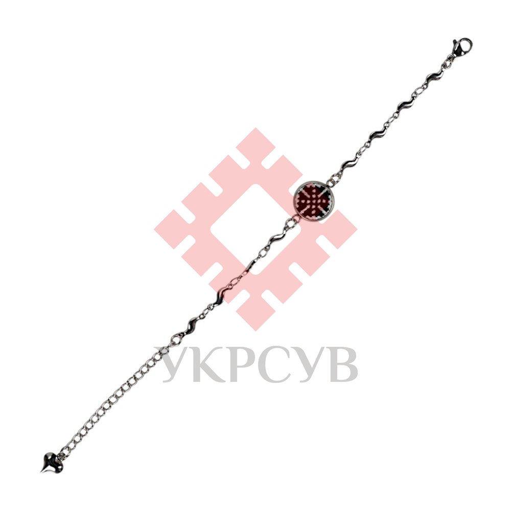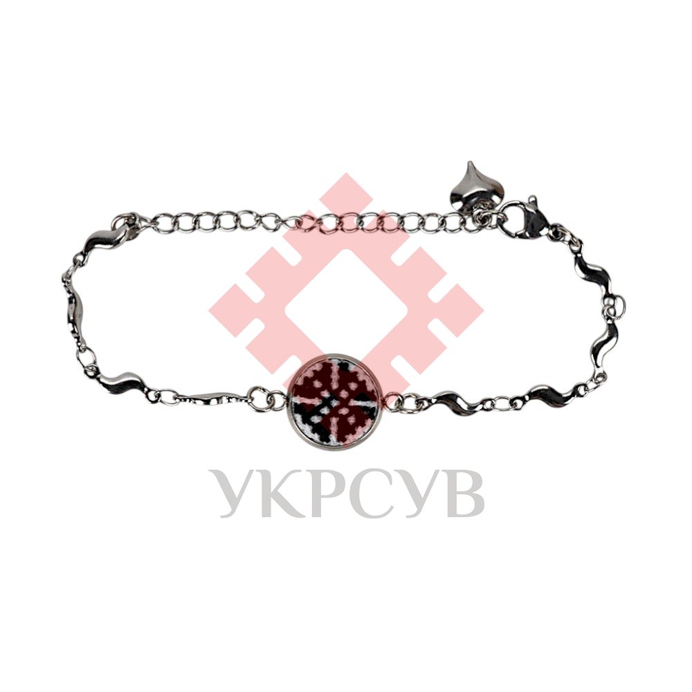 Вишитий браслет (1.2 см) – Орнамент 020Представляємо вишуканий та символічний браслет, що поєднує в собі сучасну елегантність та глибокі традиції української вишивки. Цей аксесуар стане не лише чудовою прикрасою, а й справжнім оберегом, який завжди буде з вами. Браслет має витончений металевий ланцюжок сріблястого кольору, що складається з хвилястих елементів, які додають виробу оригінальності та легкості. У центрі композиції розташований круглий медальйон, що обрамляє мініатюрну ручну вишивку хрестиком. Візерунок виконаний у традиційних червоно-чорних кольорах, що символізують любов, життєву енергію та захист. Завдяки зручній та надійній застібці-карабіну, браслет легко одягається та регулюється по довжині, що дозволяє ідеально підігнати його під розмір вашого зап'ястя. На кінці ланцюжка розташована маленька підвіска-серце, яка додає прикрасі романтичності. Цей браслет – ідеальний вибір для тих, хто цінує унікальні прикраси з національним колоритом. Він чудово доповнить як повсякденний, так і святковий образ, підкреслюючи вашу індивідуальність та любов до української культури. Характеристики:
