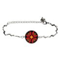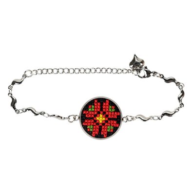 Вишитий браслет (2 см) – Орнамент 009Представляємо вишуканий та символічний браслет, що поєднує в собі сучасну елегантність та глибокі традиції української вишивки. Цей аксесуар стане не лише чудовою прикрасою, а й справжнім оберегом, який завжди буде з вами. Браслет має витончений металевий ланцюжок сріблястого кольору, що складається з хвилястих елементів, які додають виробу оригінальності та легкості. У центрі композиції розташований круглий медальйон, що обрамляє мініатюрну ручну вишивку хрестиком. Візерунок виконаний у традиційних червоно-чорних кольорах, що символізують любов, життєву енергію та захист. Завдяки зручній та надійній застібці-карабіну, браслет легко одягається та регулюється по довжині, що дозволяє ідеально підігнати його під розмір вашого зап'ястя. На кінці ланцюжка розташована маленька підвіска-серце, яка додає прикрасі романтичності. Цей браслет – ідеальний вибір для тих, хто цінує унікальні прикраси з національним колоритом. Він чудово доповнить як повсякденний, так і святковий образ, підкреслюючи вашу індивідуальність та любов до української культури. Характеристики: