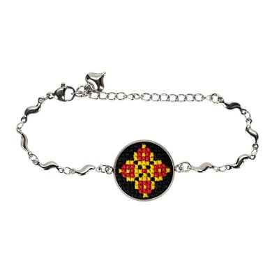 Вишитий браслет (2 см) – Орнамент 010Представляємо вишуканий та символічний браслет, що поєднує в собі сучасну елегантність та глибокі традиції української вишивки. Цей аксесуар стане не лише чудовою прикрасою, а й справжнім оберегом, який завжди буде з вами. Браслет має витончений металевий ланцюжок сріблястого кольору, що складається з хвилястих елементів, які додають виробу оригінальності та легкості. У центрі композиції розташований круглий медальйон, що обрамляє мініатюрну ручну вишивку хрестиком. Візерунок виконаний у традиційних червоно-чорних кольорах, що символізують любов, життєву енергію та захист. Завдяки зручній та надійній застібці-карабіну, браслет легко одягається та регулюється по довжині, що дозволяє ідеально підігнати його під розмір вашого зап'ястя. На кінці ланцюжка розташована маленька підвіска-серце, яка додає прикрасі романтичності. Цей браслет – ідеальний вибір для тих, хто цінує унікальні прикраси з національним колоритом. Він чудово доповнить як повсякденний, так і святковий образ, підкреслюючи вашу індивідуальність та любов до української культури. Характеристики: