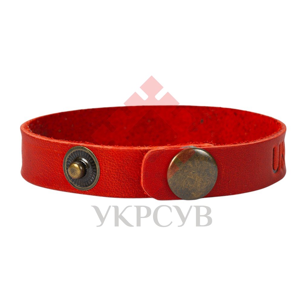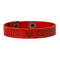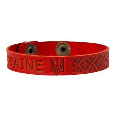 Браслет "Ukraine" (червоний)Стильний шкіряний браслет стане яскравим аксесуаром для щоденного образу та символом патріотичної підтримки України. Виріб виконаний із натуральної шкіри, прикрашений тисненням з написом Ukraine, гербом та орнаментом у національному стилі.