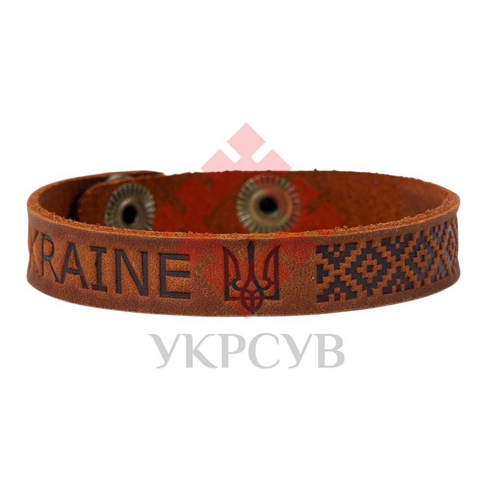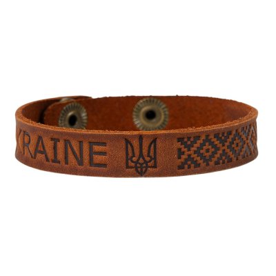 Браслет "Ukraine" (рудий)Стильний шкіряний браслет стане яскравим аксесуаром для щоденного образу та символом патріотичної підтримки України. Виріб виконаний із натуральної шкіри, прикрашений тисненням з написом Ukraine, гербом та орнаментом у національному стилі.