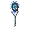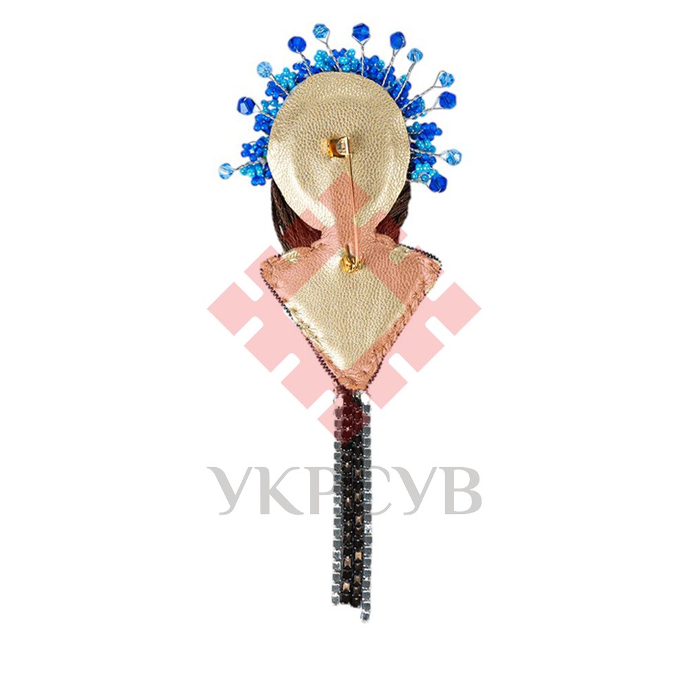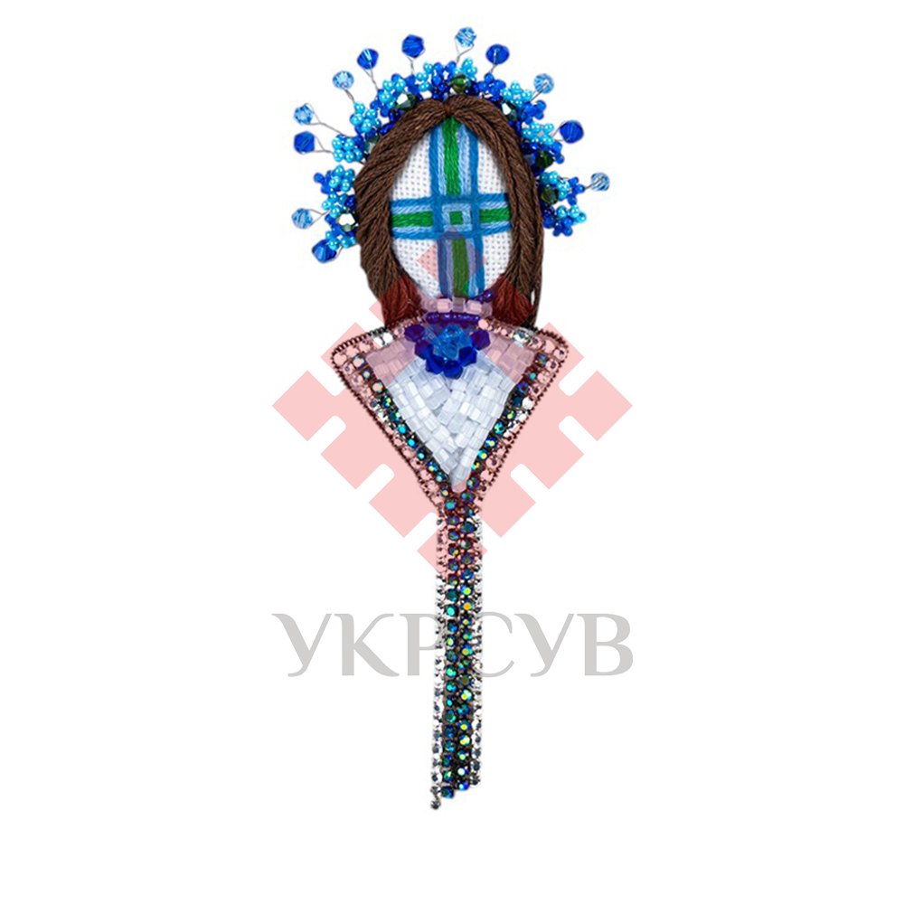Українські мотиви: Брошка виконана в ніжній біло-блакитній кольоровій гамі, що символізує чистоту та мир. Вона прикрашена вишивкою хрестиком, що імітує народні візерунки, а також мерехтливими елементами з бісеру та намистин, що додають виробу елегантності та блиску.