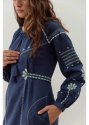 Сукня «Зоряна» – це вишукана інтерпретація української традиції, натхненна давнім рушником із Полтавщини. Глибокий темно-синій колір полотна нагадує нічне небо, на якому розсипані зорі, а ніжна вишивка відтворює гармонію Всесвіту, сповнену символів життя, світла й духовності.