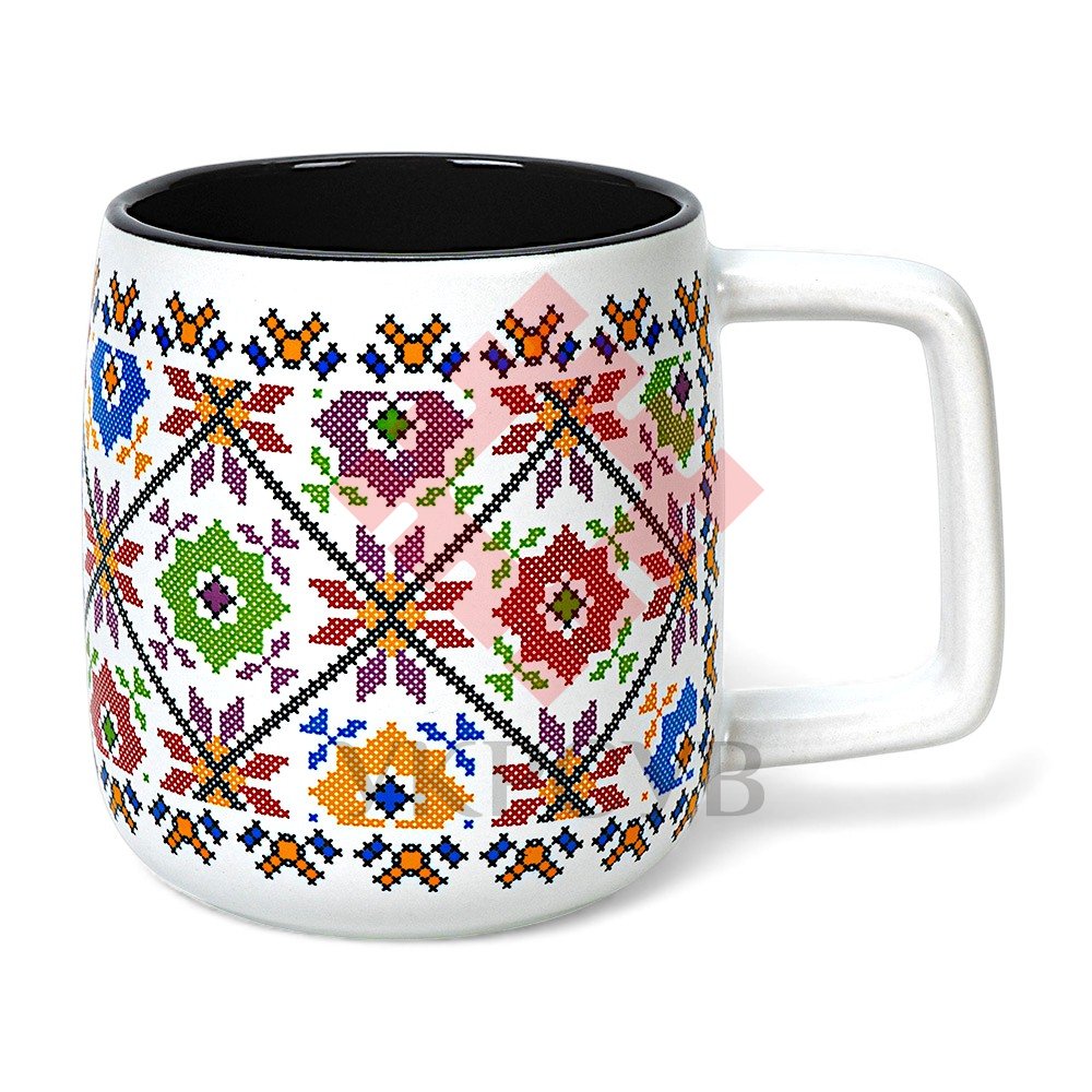 Чашка Орнамент №03, 420 млЯскрава чашка з традиційним українським орнаментом створена для тих, хто цінує атмосферність та культурний зміст у звичних речах. Візерунок нагадує ручну вишивку — з кольоровими квітками, ромбами, дрібними геометричними елементами, що оживають на білому тлі та наповнюють виріб теплом народної майстерності. Матовий корпус робить горнятко приємним на дотик і додає сучасної естетики. Чорна глянцева внутрішня частина створює стильний контраст і робить напій візуально насиченішим. Об’єм 420 мл ідеально підійде тим, хто любить великі порції чаю, ароматної кави або какао. Чашка має зручну форму з широкою ручкою та надійну основу завдяки нижньому діаметру 70 мм. Це не просто посуд, а затишний настрій, втілений у кольорах та орнаментах, які нагадують про українські традиції.
