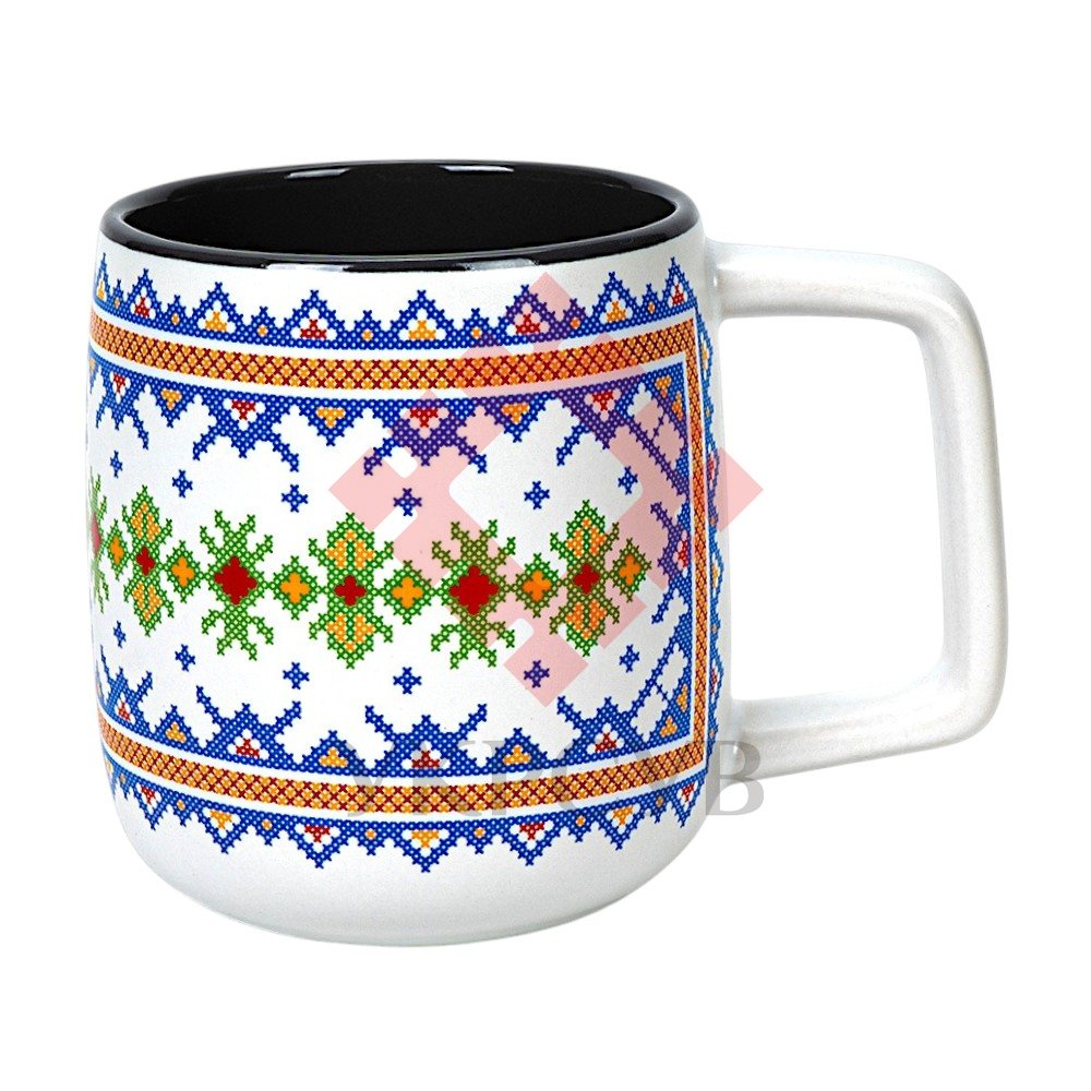 Чашка Орнамент №04, 420 млЯскрава чашка з традиційним українським орнаментом створена для тих, хто цінує атмосферність та культурний зміст у звичних речах. Візерунок нагадує ручну вишивку — з кольоровими квітками, ромбами, дрібними геометричними елементами, що оживають на білому тлі та наповнюють виріб теплом народної майстерності. Матовий корпус робить горнятко приємним на дотик і додає сучасної естетики. Чорна глянцева внутрішня частина створює стильний контраст і робить напій візуально насиченішим. Об’єм 420 мл ідеально підійде тим, хто любить великі порції чаю, ароматної кави або какао. Чашка має зручну форму з широкою ручкою та надійну основу завдяки нижньому діаметру 70 мм. Це не просто посуд, а затишний настрій, втілений у кольорах та орнаментах, які нагадують про українські традиції.