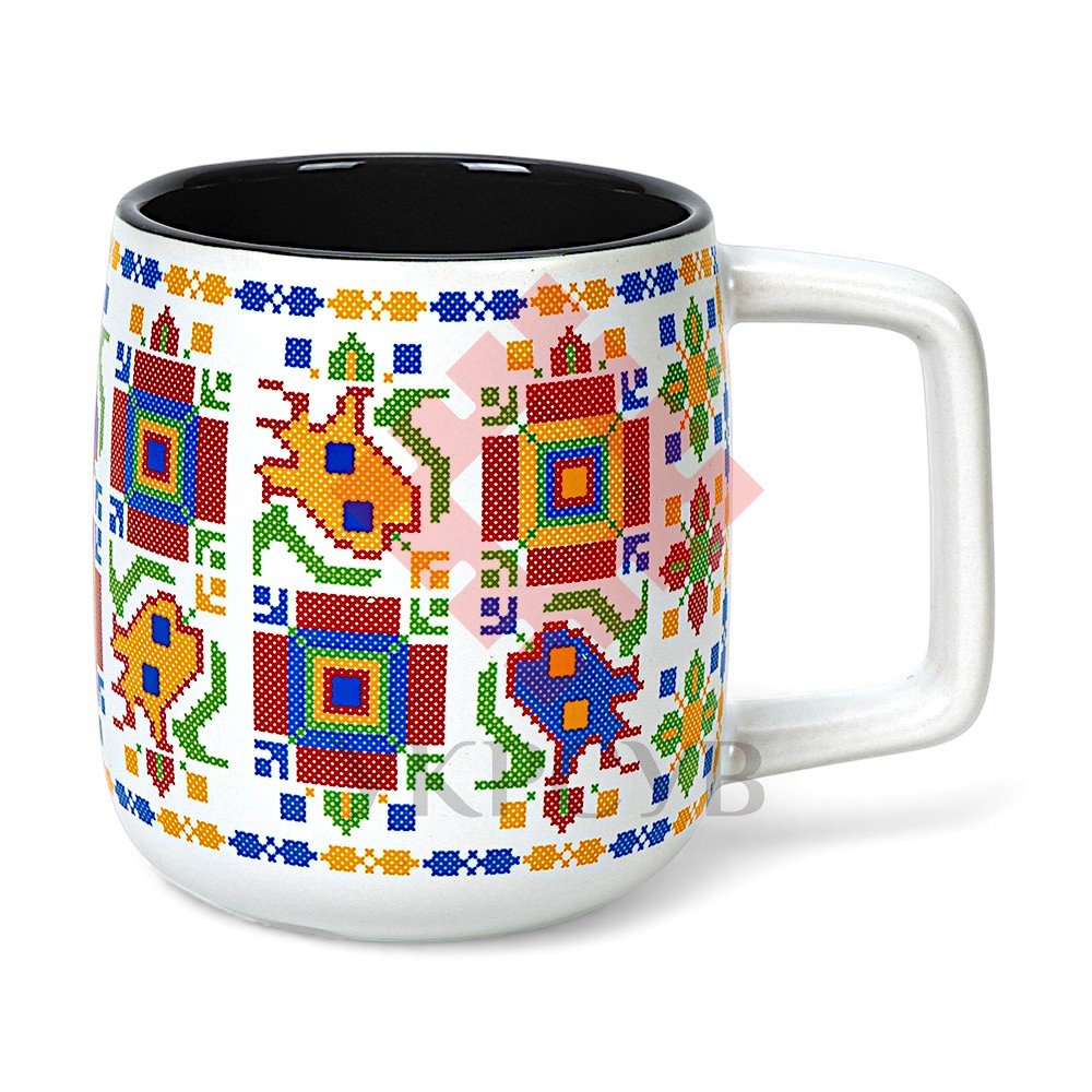Чашка Орнамент №05, 420 млЯскрава чашка з традиційним українським орнаментом створена для тих, хто цінує атмосферність та культурний зміст у звичних речах. Візерунок нагадує ручну вишивку — з кольоровими квітками, ромбами, дрібними геометричними елементами, що оживають на білому тлі та наповнюють виріб теплом народної майстерності. Матовий корпус робить горнятко приємним на дотик і додає сучасної естетики. Чорна глянцева внутрішня частина створює стильний контраст і робить напій візуально насиченішим. Об’єм 420 мл ідеально підійде тим, хто любить великі порції чаю, ароматної кави або какао. Чашка має зручну форму з широкою ручкою та надійну основу завдяки нижньому діаметру 70 мм. Це не просто посуд, а затишний настрій, втілений у кольорах та орнаментах, які нагадують про українські традиції.