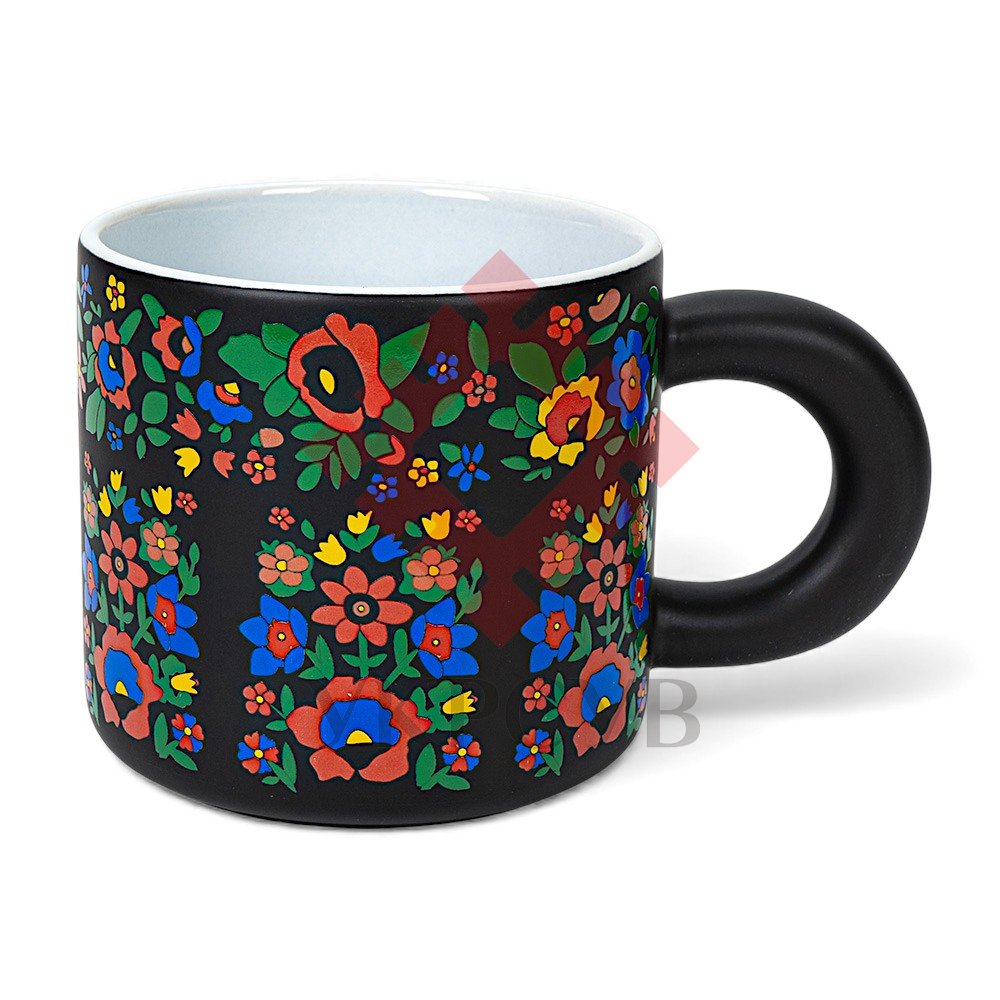 Чашка Орнамент №09, 390 млЯскрава й затишна чашка з традиційним українським орнаментом наповнить кожен ковток теплом і атмосферністю. На матовому чорному тлі розквітають барвисті квіти — червоні, сині, жовті, зелені — у стилі народного декоративного розпису. Композиція створює відчуття ритму й об’ємності, ніби візерунок вишитий вручну. Приємна матова поверхня надає виробу сучасного вигляду, а біла внутрішня частина створює контраст, роблячи напій ще апетитнішим. Об’єм 390 мл дозволяє насолоджуватися улюбленою кавою, чаєм або трав’яними напоями в достатній кількості. Рівні діаметри та стійка основа роблять чашку практичною для щоденного використання. Масивна кругла ручка додає комфорту й особливого шарму. Це горнятко — поєднання автентичного українського стилю та сучасного дизайну, яке створює гарний настрій із самого ранку.