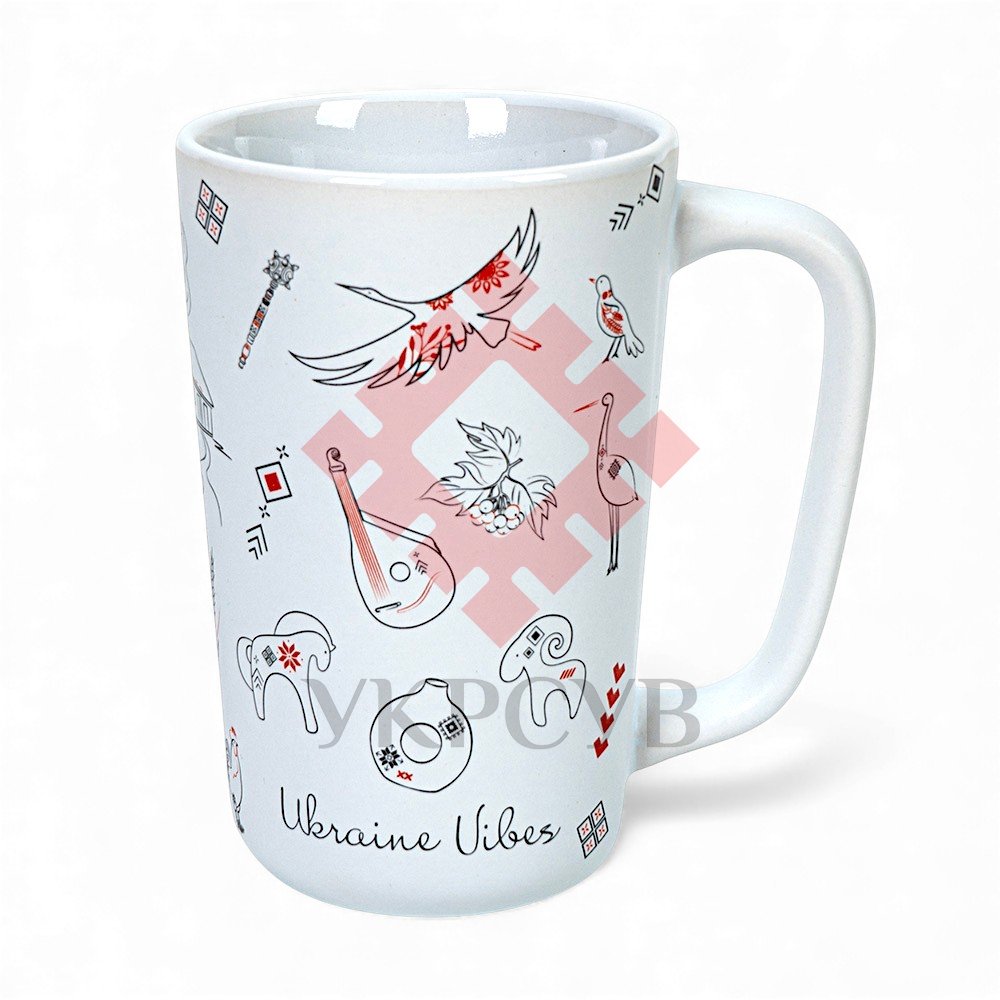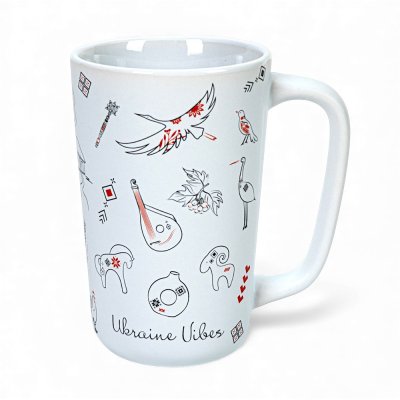 Чашка Коріння та крила Ukrainian Vibes, 410 млСтильна чашка з унікальною ілюстрацією “Коріння та крила” передає атмосферу української культури через легкі, лінійні символи. На білому тлі оживають птахи, калинове гроно, кобза, колосся, глечики та інші елементи, що ніжно й ненав’язливо нагадують про наші традиції, витоки та силу, яка надихає рухатися вперед. Матовий білий корпус приємний на дотик, а висока форма чашки дозволяє довше зберігати тепло напою. Об’єм 410 мл — чудовий вибір для великих порцій кави, какао чи чаю. Верхній діаметр 95 мм робить горнятко зручним у користуванні, а висота 135 мм додає елегантності силуету. Зручна класична ручка забезпечує комфортне тримання навіть під час тривалих розмов або роботи. Ця чашка поєднує сучасний мінімалістичний стиль із глибокими українськими сенсами — і стане чудовим подарунком або стильним супутником на щодень.