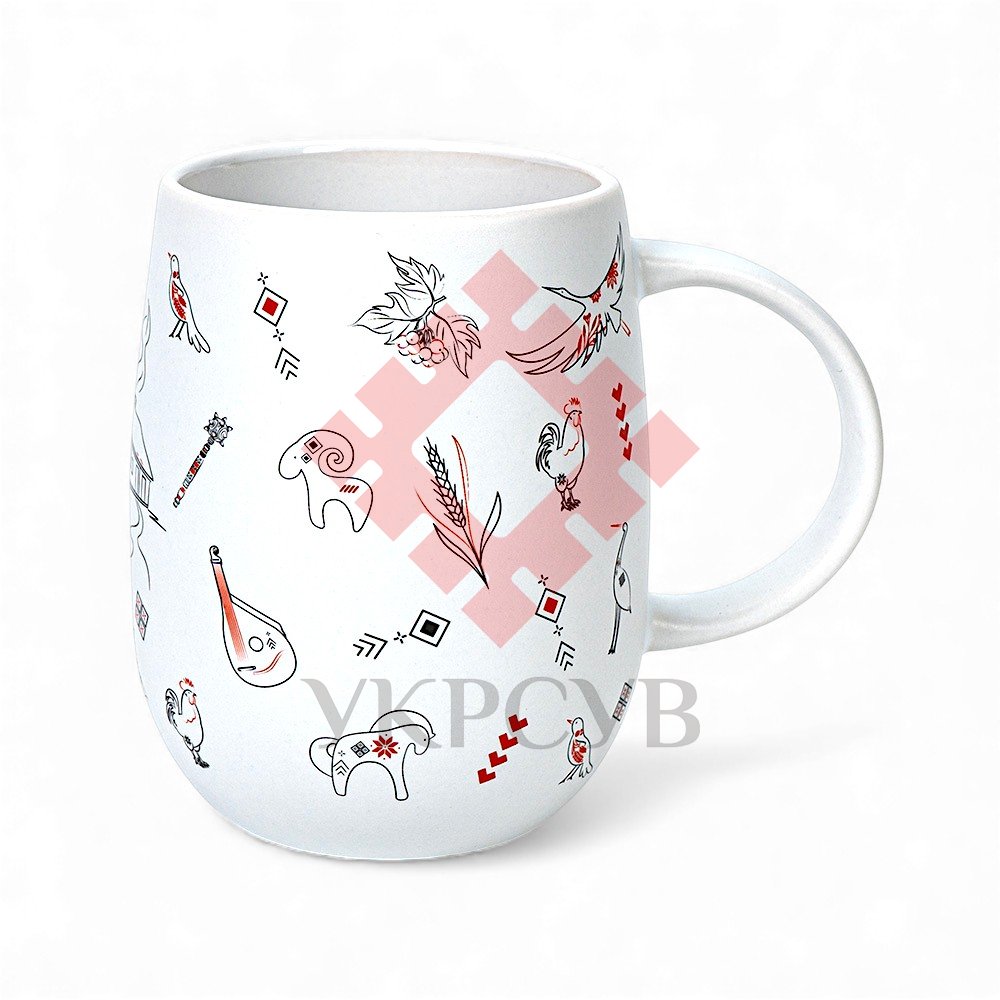 Чашка Коріння та крила, 350 млСтильна матова чашка “Коріння та крила” поєднує теплоту українських символів і сучасну легкість дизайну. На білому тлі розміщені лінійні ілюстрації — птахи, колосся, калинове гроно, музичні інструменти, керамічні фігурки та декоративні елементи у ніжних відтінках червоного й чорного. Вони створюють атмосферу затишку й нагадують про культурну спадщину, що надихає та дає сили. Ергономічна форма з плавним звуженням донизу робить горнятко зручним у триманні, а матова поверхня приємна на дотик. Об’єм 350 мл чудово підходить для кави, чаю або трав’яних напоїв, а вузький нижній діаметр у 54 мм забезпечує комфортне охоплення долонею. Висота 105 мм надає чашці елегантного видовженого силуету, а зручна округла ручка робить користування ще приємнішим. Це горнятко — ідеальний вибір для тих, хто любить спокійний дизайн з глибоким українським сенсом у кожній деталі.