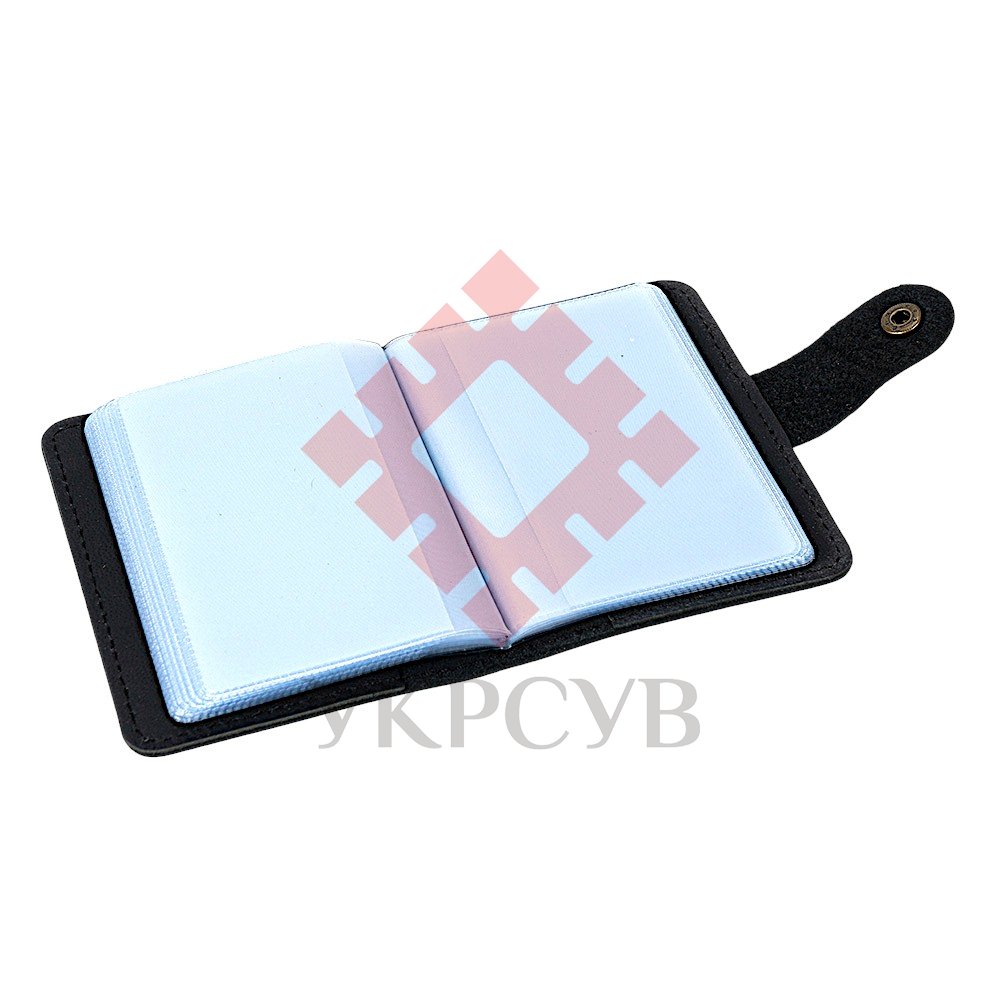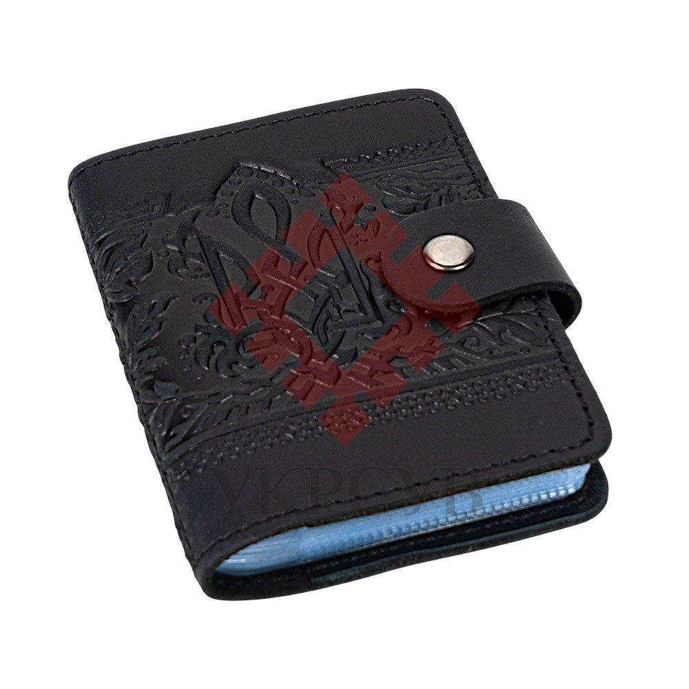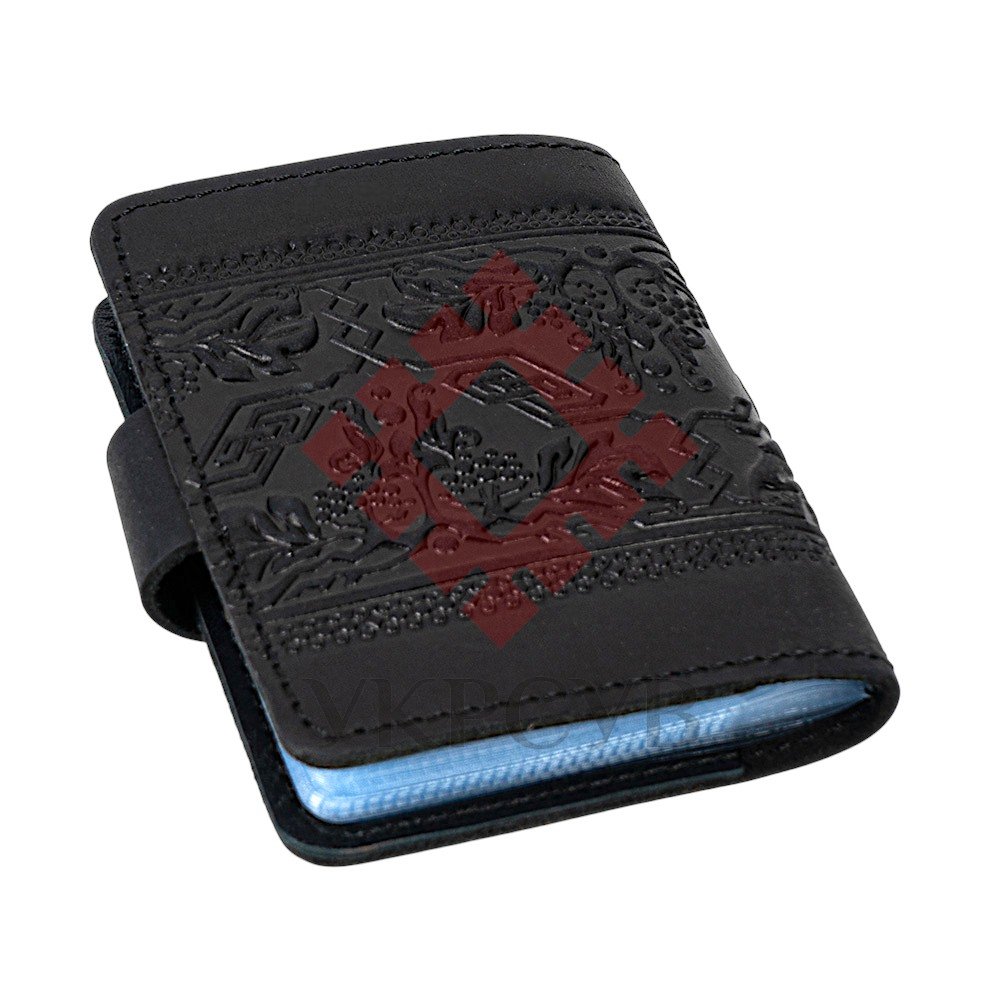 Візитниця "Тризуб – калина", чорнийЧорна шкіряна візитниця з тисненим тризубом і калиновим орнаментом — універсальний і водночас виразний аксесуар для щоденного використання. Об’ємний візерунок із калиновими гронами, листям і плетеним тризубом виглядає контрастно й особливо елегантно на тлі глибокого чорного кольору. Усередині передбачено 20 прозорих файлів, які зручно підходять для зберігання візиток, банківських карток або невеликих документів. Металева кнопка гарантує надійне закриття та захищає вміст від випадкового випадання. Натуральна шкіра, акуратне прошиття та мінімалістичний силует роблять цю модель надійною, довговічною й естетично бездоганною. Вона чудово підходить як для особистого користування, так і як подарунок.