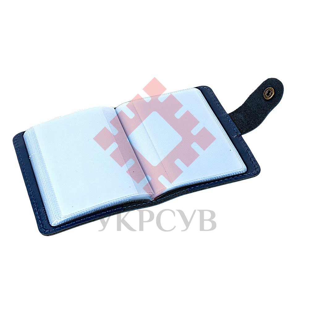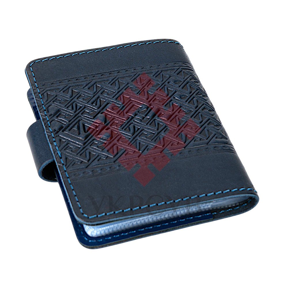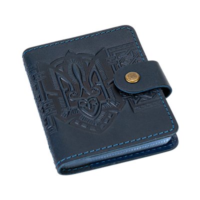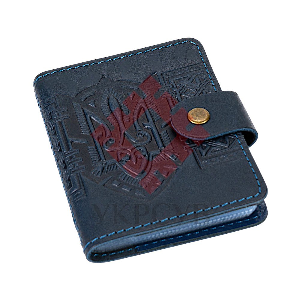 Візитниця "Тризуб – геометрія", темно-синійТемно-синя шкіряна візитниця з тисненим тризубом і геометричним орнаментом поєднує елегантність, стриманість та символічність. Насичений синій відтінок додає виробу глибини й сучасного характеру, а натуральна шкіра забезпечує приємну фактуру та довговічність. Усередині розміщено 20 прозорих файлів — зручне рішення для візиток, банківських карток або невеликих документів. Металева кнопка гарантує надійне закриття та захищає аксесуар від випадкового відкривання. Акуратне прошиття, якісні матеріали й продумані деталі роблять цю візитницю універсальним і стильним вибором як для щоденного використання, так і для подарунка.