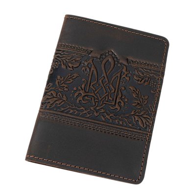 Обкладинка для військового квитка "Тризуб – калина", темно-коричневийТемно-коричнева шкіряна обкладинка з тисненим тризубом і калиновим орнаментом — це стильний та символічний аксесуар, що захищає військовий квиток і водночас підкреслює українську ідентичність. Об’ємний візерунок із гронами калини, листям і плетеним тризубом виглядає виразно та додає виробу автентичного шарму. Натуральна шкіра забезпечує високу міцність та зносостійкість, а приємна фактура й охайне прошиття роблять обкладинку не лише практичною, а й естетично привабливою. Усередині передбачені зручні кишені для документа, а також додаткові відділення, які можна використати для карток чи інших невеликих паперів. Темно-коричнева колір надає аксесуару сучасного вигляду, а символічне тиснення робить його чудовим варіантом як для особистого користування, так і для подарунка.