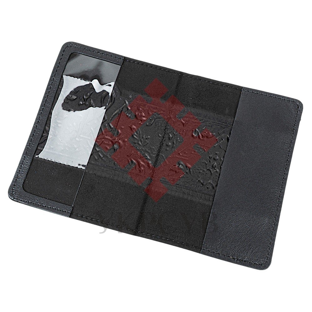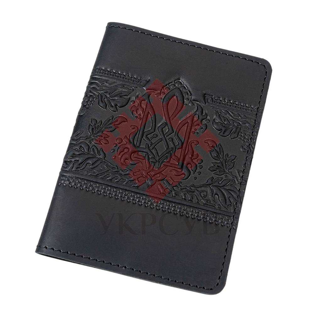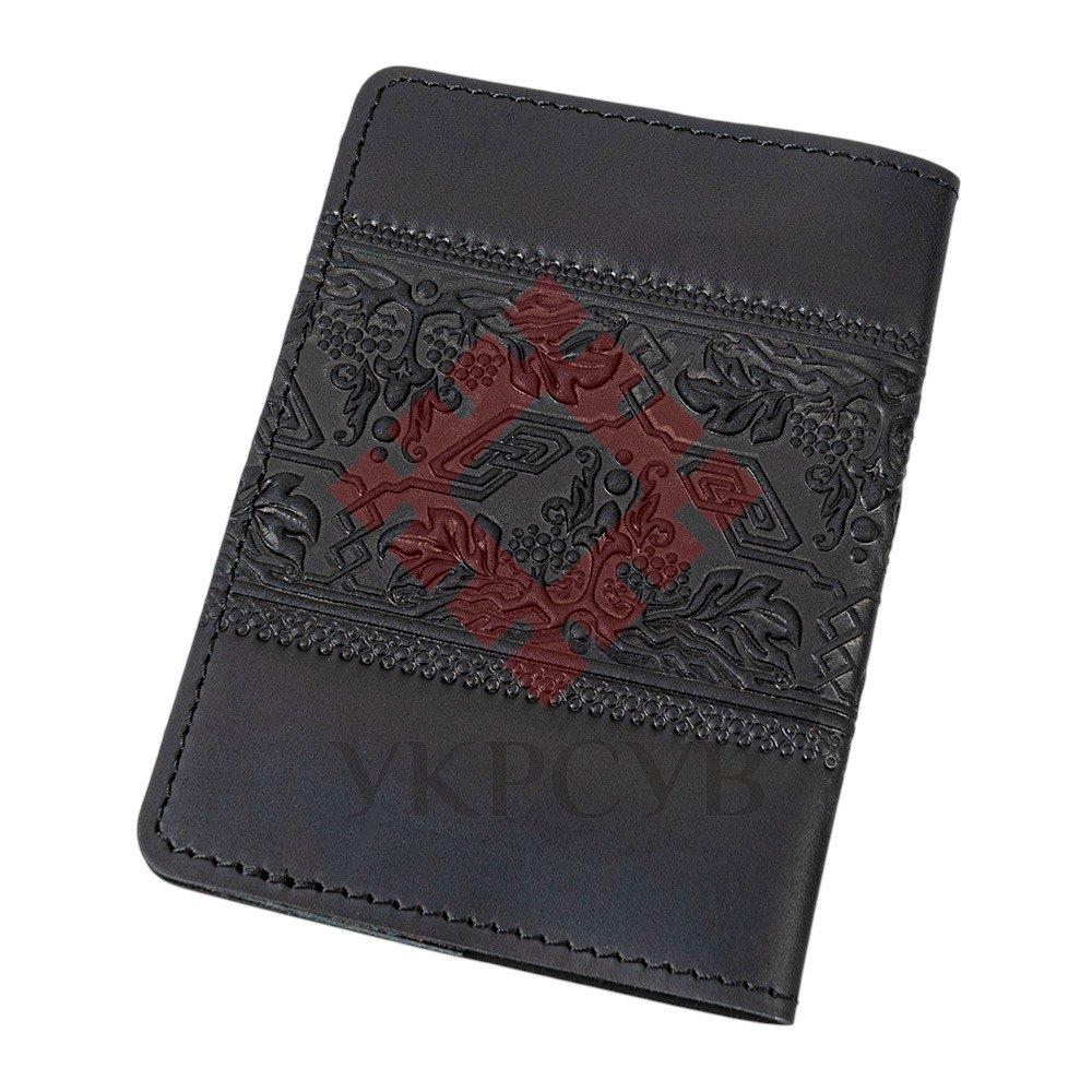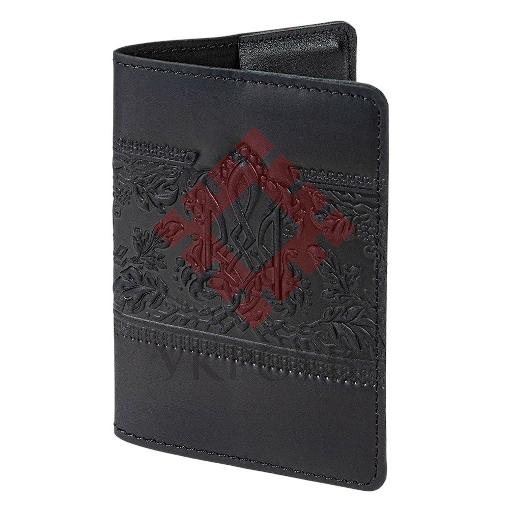 Обкладинка для військового квитка "Тризуб – калина", чорнийЧорна шкіряна обкладинка з тисненим тризубом і калиновим орнаментом — це стильний та символічний аксесуар, що захищає військовий квиток і водночас підкреслює українську ідентичність. Об’ємний візерунок із гронами калини, листям і плетеним тризубом виглядає виразно та додає виробу автентичного шарму. Натуральна шкіра забезпечує високу міцність та зносостійкість, а приємна фактура й охайне прошиття роблять обкладинку не лише практичною, а й естетично привабливою. Усередині передбачені зручні кишені для документа, а також додаткові відділення, які можна використати для карток чи інших невеликих паперів. Чорний колір надає аксесуару сучасного вигляду, а символічне тиснення робить його чудовим варіантом як для особистого користування, так і для подарунка.