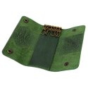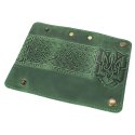 Ключниця "Тризуб - геометрія", зеленийСтильна шкіряна ключниця у глибокому зеленому кольорі доповнена виразним тисненням з поєднанням тризуба та геометричного орнаменту. Такий аксесуар виглядає солідно та водночас сучасно, надаючи щоденним речам національного характеру й індивідуальності. Модель виконана з натуральної шкіри, приємної на дотик та витривалої у використанні. Всередині розташовано шість металевих карабінів, які надійно фіксують ключі та не дають їм загубитися чи пошкодити вміст сумки. Застібається ключниця на металеві кнопки, що забезпечують швидкий доступ і надійне закриття.