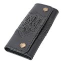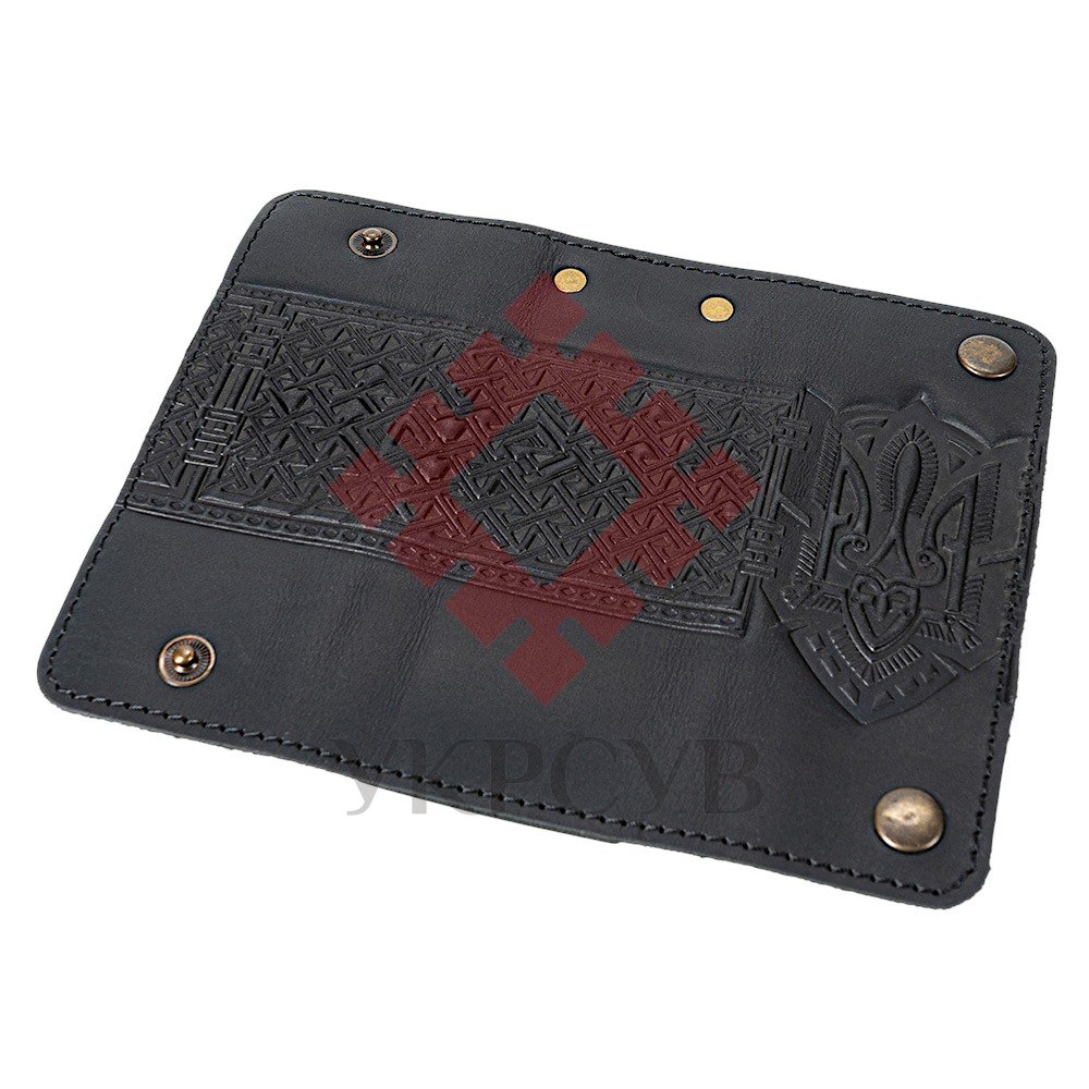 Ключниця "Тризуб - геометрія", чорнийСтильна шкіряна ключниця у глибокому чорному кольорі доповнена виразним тисненням з поєднанням тризуба та геометричного орнаменту. Такий аксесуар виглядає солідно та водночас сучасно, надаючи щоденним речам національного характеру й індивідуальності. Модель виконана з натуральної шкіри, приємної на дотик та витривалої у використанні. Всередині розташовано шість металевих карабінів, які надійно фіксують ключі та не дають їм загубитися чи пошкодити вміст сумки. Застібається ключниця на металеві кнопки, що забезпечують швидкий доступ і надійне закриття.