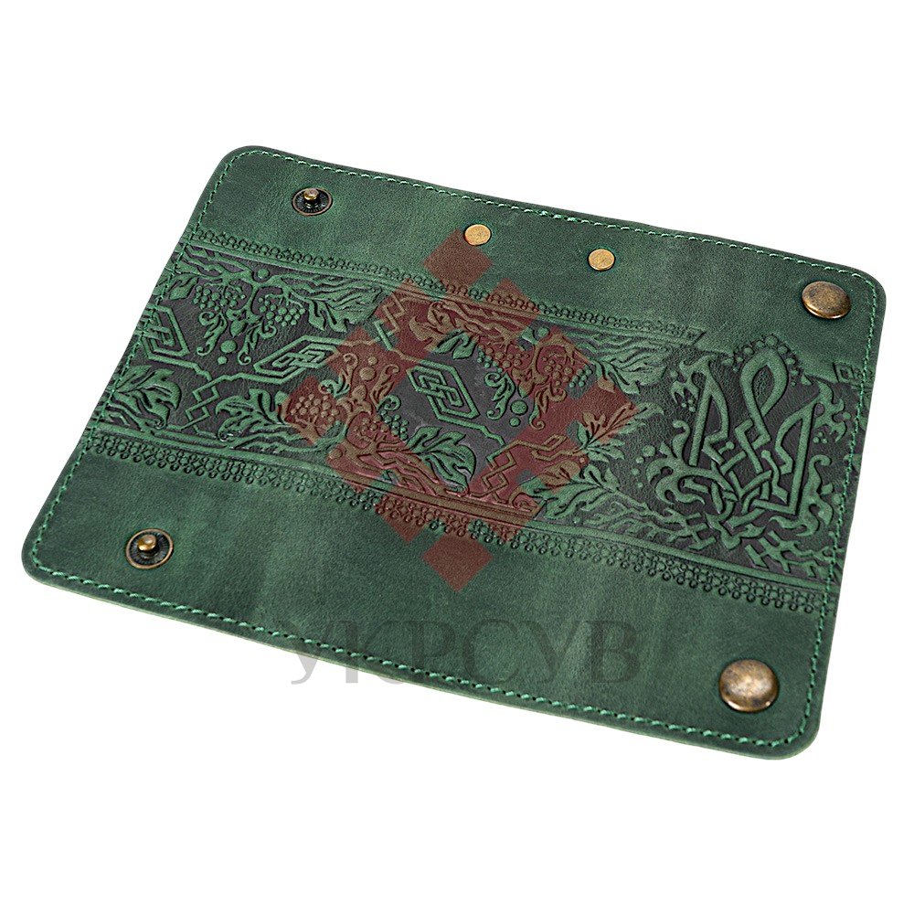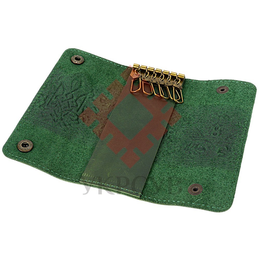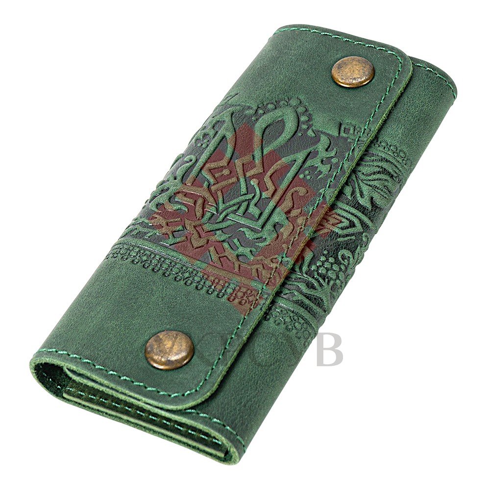 Ключниця "Тризуб – калина", зеленийСтильна ключниця з натуральної шкіри, створена для тих, хто цінує символіку та український характер у щоденних речах. Бірюзовий колір додає виробу глибини, а тиснений візерунок із Тризубом та калиновою гілкою підкреслює його автентичність. Ключниця зберігає форму, приємна на дотик та надійно захищає ключі від пошкоджень чи втрати. Усередині розташовано 6 міцних металевих карабінів, що дозволяють зручно організувати необхідні ключі.