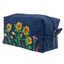 Вишита косметичка №977Вишита косметичка — це яскравий аксесуар, створений для тих, хто любить поєднання практичності та декоративності. Насичений синій колір тканини чудово відтінює вишиті соняхи й польові квіти, роблячи дизайн особливо виразним і життєрадісним. Містка прямокутна форма легко вміщує косметику, доглядові засоби та всі необхідні дрібниці. Міцна блискавка забезпечує зручний доступ до вмісту, а бавовняна підкладка всередині додає акуратності й захищає речі від пошкоджень. Завдяки щільній тканині косметичка добре тримає форму та підходить для щоденного використання й подорожей. Це чудовий вибір для тих, хто цінує українські мотиви, яскраві відтінки та якісну ручну роботу.
