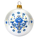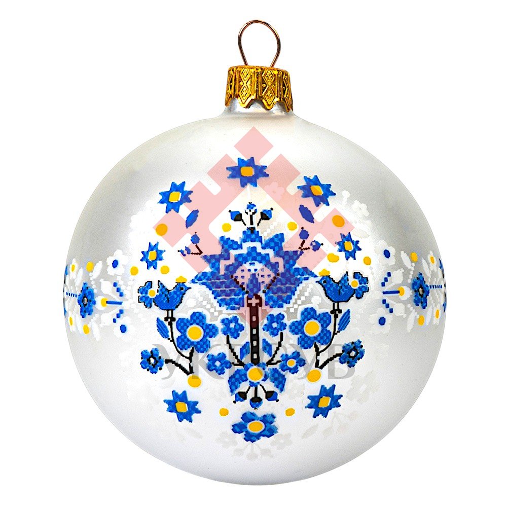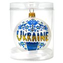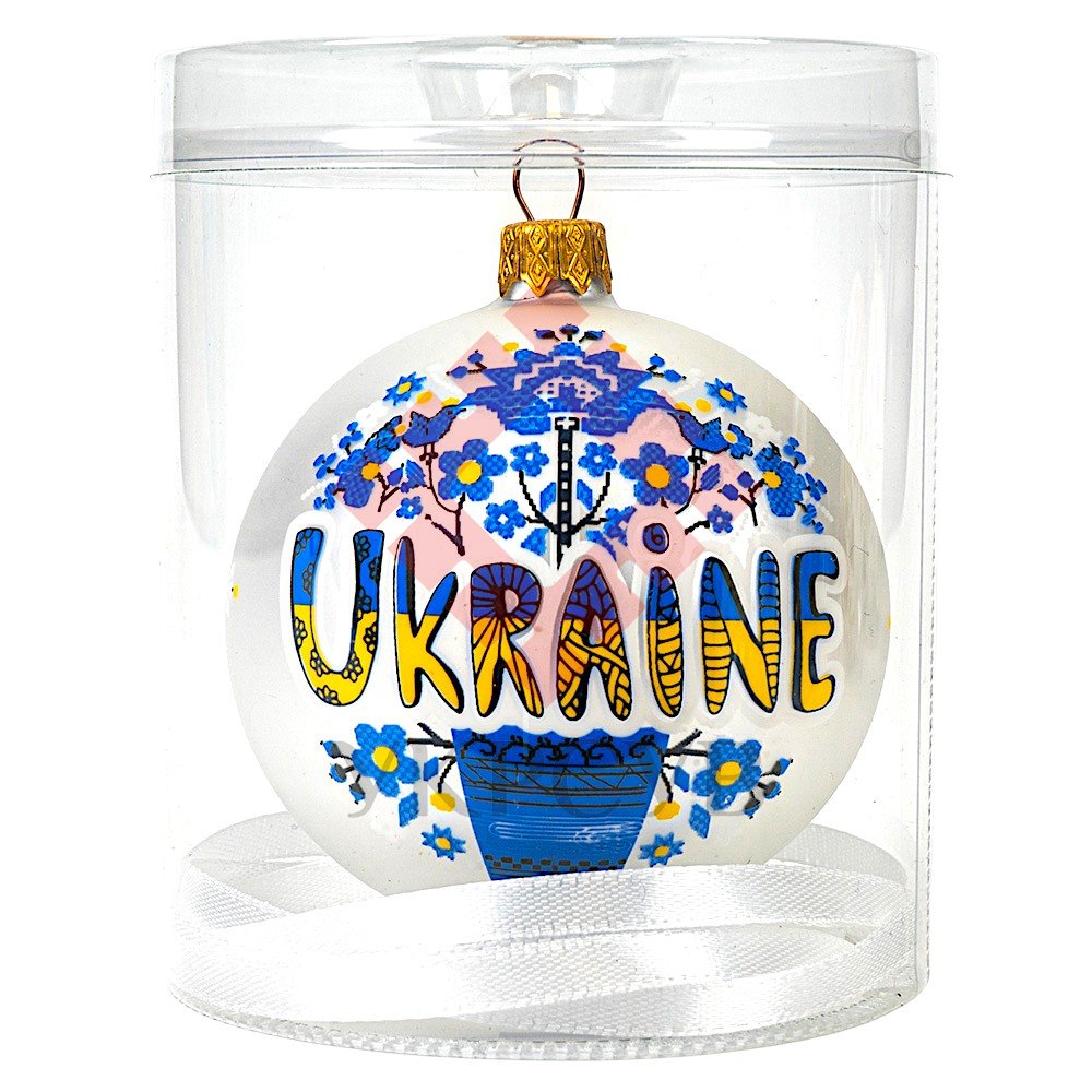 Ялинкова кулька «UKRAINE»Ялинкова кулька «UKRAINE» — це святкова прикраса з глибоким символічним змістом, що поєднує сучасний дизайн і традиційні українські мотиви. Напис «UKRAINE», виконаний у синьо-жовтих кольорах, підкреслює національну ідентичність, а орнамент у стилі української вишивки додає виробу автентичності та теплоти. Композицію доповнює декоративний вазон із квітами — образ, що асоціюється з домом, родинним затишком і життєдайною силою. Білий фон робить орнамент яскравим і виразним, а сама кулька гармонійно виглядає як на класичній, так і на сучасній ялинці.