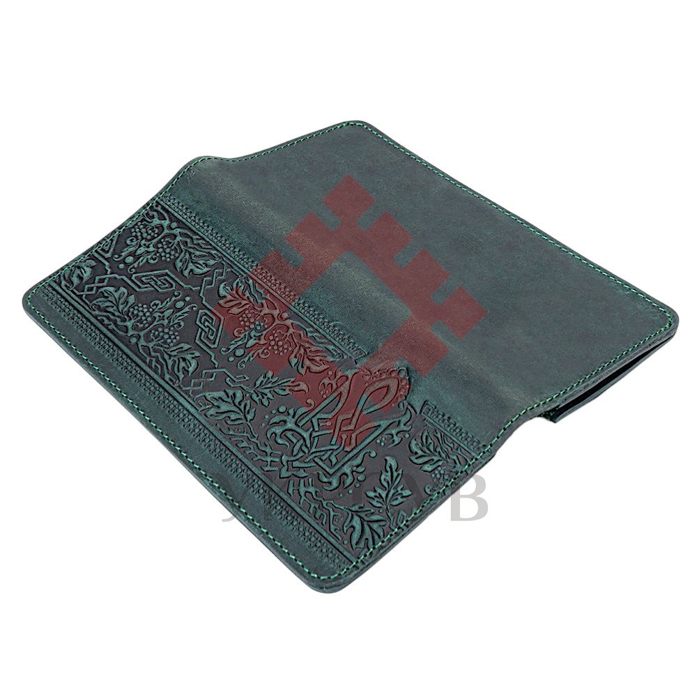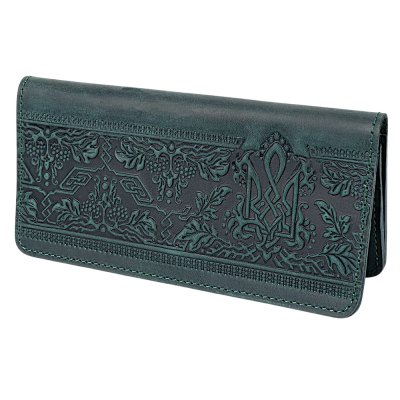 Гаманець довгий "Тризуб - калина", темно-зеленийДовгий гаманець «Тризуб - калина» поєднує в собі національну символіку та витончену орнаментику. Рельєфне тиснення із зображенням Тризуба та гілок калини створює глибоку композицію, що виразно підкреслює текстуру натуральної шкіри. Орнамент із рослинними та геометричними елементами формує гармонійний візерунок із характерним українським акцентом. Модель виглядає стримано й елегантно, зберігаючи баланс між символічністю та сучасним стилем. Завдяки продуманій конструкції гаманець залишається тонким на вигляд, але водночас містким і зручним для щоденного користування.