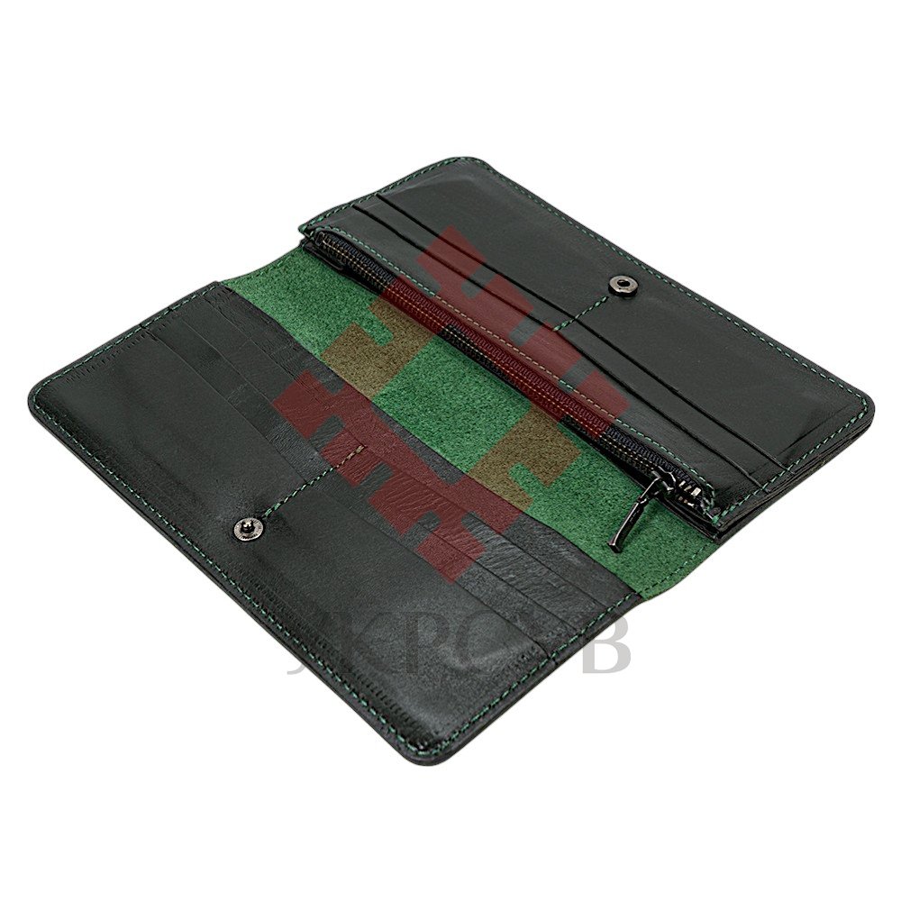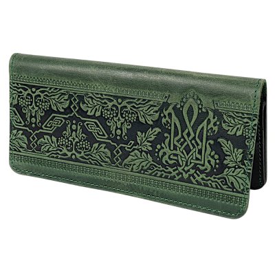 Гаманець довгий "Тризуб - калина", зеленийДовгий гаманець «Тризуб - калина» поєднує в собі національну символіку та витончену орнаментику. Рельєфне тиснення із зображенням Тризуба та гілок калини створює глибоку композицію, що виразно підкреслює текстуру натуральної шкіри. Орнамент із рослинними та геометричними елементами формує гармонійний візерунок із характерним українським акцентом. Модель виглядає стримано й елегантно, зберігаючи баланс між символічністю та сучасним стилем. Завдяки продуманій конструкції гаманець залишається тонким на вигляд, але водночас містким і зручним для щоденного користування.