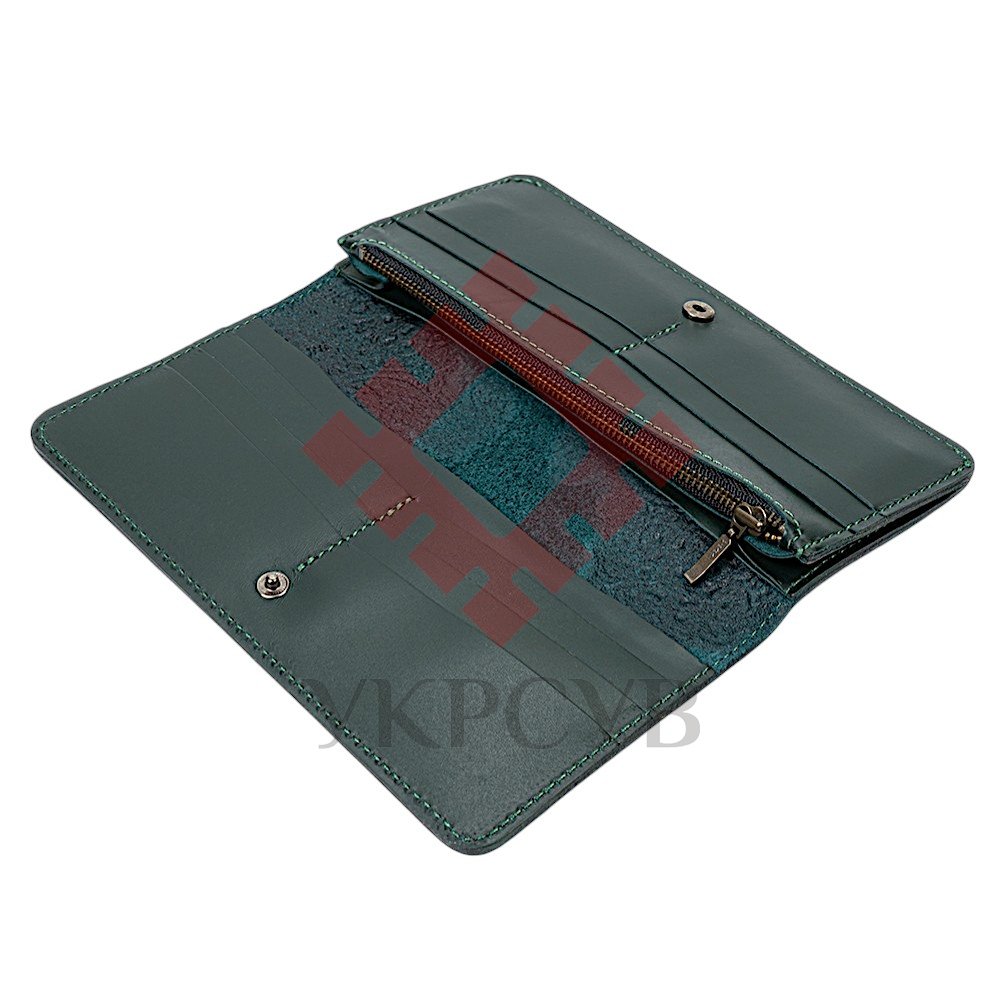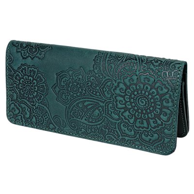 Гаманець довгий "Квіти", темно-зеленийДовгий гаманець «Квіти» — це елегантний аксесуар із виразним рельєфним орнаментом. Глибоке тиснення з квітковими мотивами створює об’ємний візерунок, який підкреслює текстуру натуральної шкіри та додає виробу характеру. Вишукані декоративні елементи у поєднанні з продуманими лініями формують гармонійний дизайн, що виглядає стильно й сучасно. Модель має витончений силует і водночас залишається практичною та місткою для щоденного використання. Раціональна організація внутрішнього простору дозволяє зручно розмістити купюри, картки та монети, зберігаючи порядок і комфорт у користуванні.