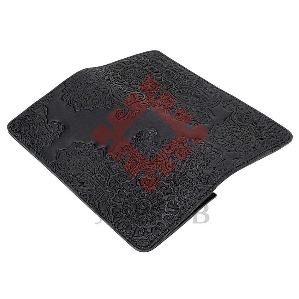 Гаманець довгий "Квіти", чорнийДовгий гаманець «Квіти» — це елегантний аксесуар із виразним рельєфним орнаментом. Глибоке тиснення з квітковими мотивами створює об’ємний візерунок, який підкреслює текстуру натуральної шкіри та додає виробу характеру. Вишукані декоративні елементи у поєднанні з продуманими лініями формують гармонійний дизайн, що виглядає стильно й сучасно. Модель має витончений силует і водночас залишається практичною та місткою для щоденного використання. Раціональна організація внутрішнього простору дозволяє зручно розмістити купюри, картки та монети, зберігаючи порядок і комфорт у користуванні.