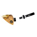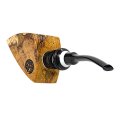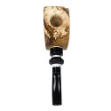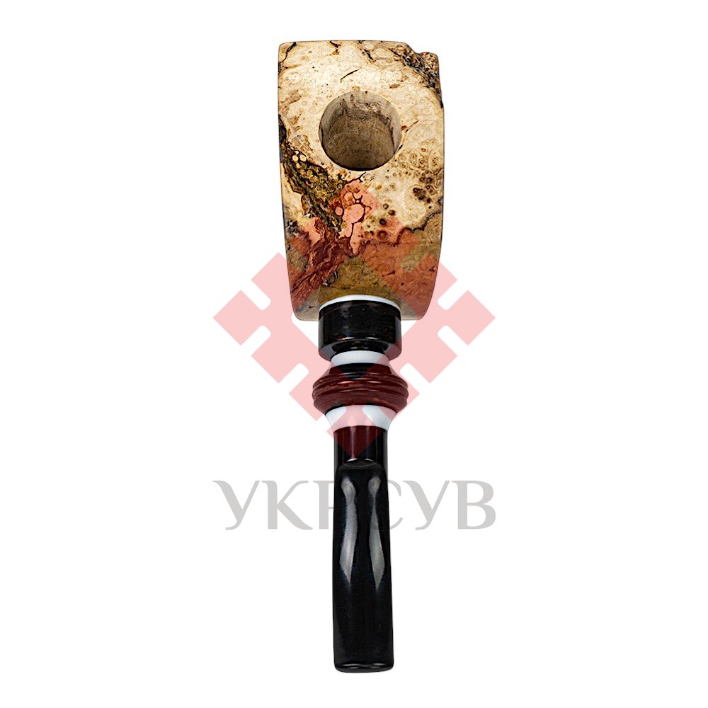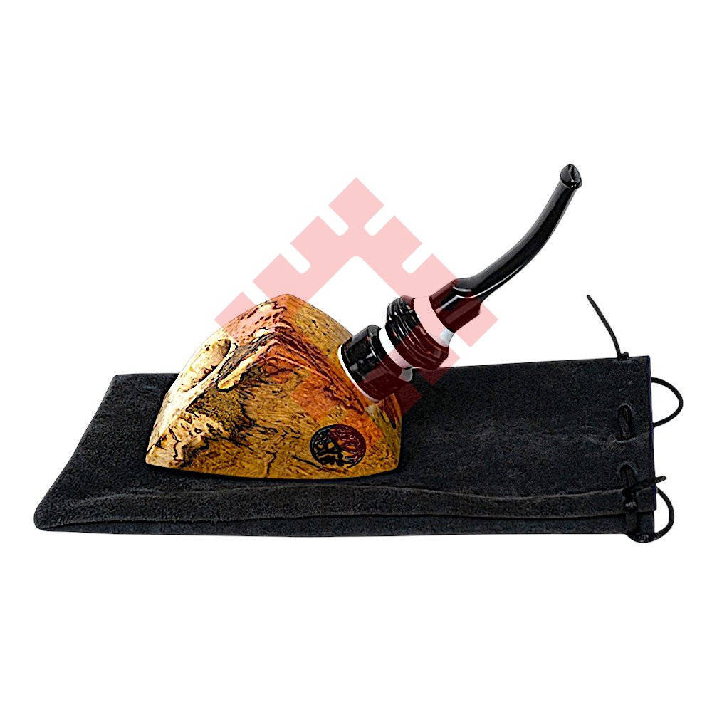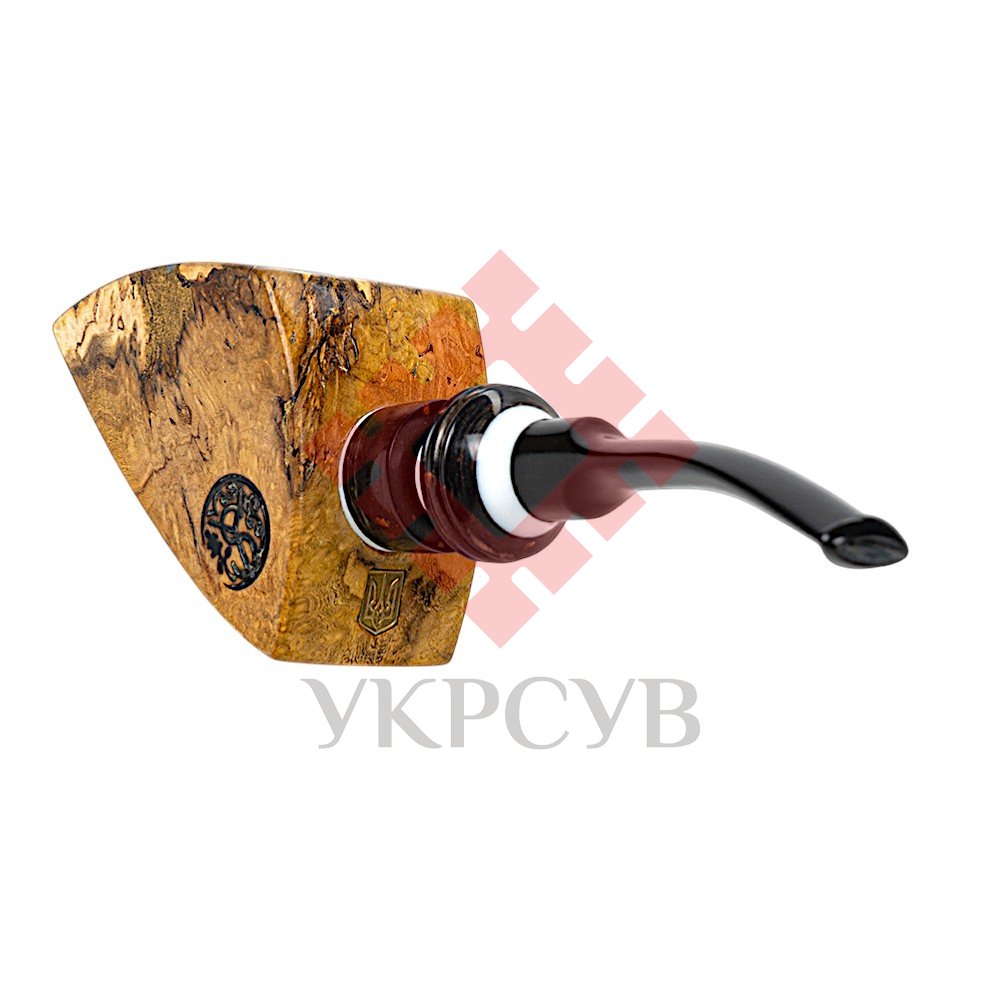 Люлька для куріння ручної роботи «Камінь степу», акація, кам'яний мундштукОригінальна люлька для куріння ручної роботи, вирізьблена з натуральної акації та декоративного капу, поєднує природну красу деревини з виразною геометричною формою. Світлий відтінок дерева з контрастними природними прожилками створює ефект живого малюнка, який неможливо повторити. Завдяки покриттю карнаубським воском поверхня отримує м’який блиск і додатковий захист, підкреслюючи глибину структури дерева. Незвичайна форма чаші надає люльці характеру та сучасного вигляду, водночас зберігаючи традиційну функціональність. Мундштук виконаний з акрилу та штучного каменю, що створює елегантний контраст між темними та світлими елементами. Конструкція розрахована на стандартний фільтр 8 мм, завдяки чому куріння стає більш м’яким і комфортним. До комплекту входять замшевий чохол для зберігання та шкіряна підставка, що дозволяє зручно розмістити люльку та підкреслює її декоративність. Такий виріб стане чудовим подарунком для поціновувачів класичних люльок, колекціонерів і тих, хто цінує унікальні речі ручної роботи.
