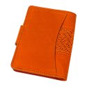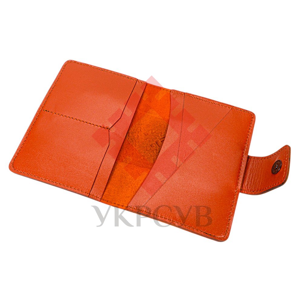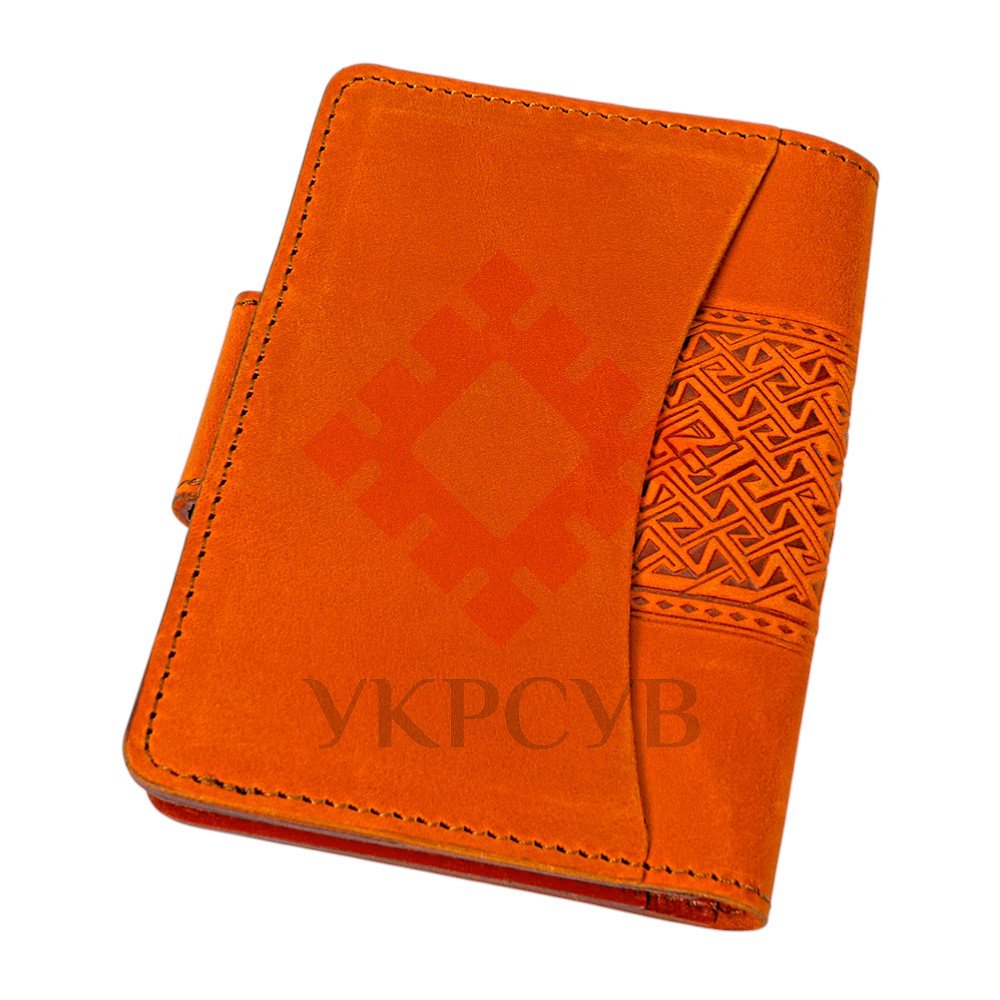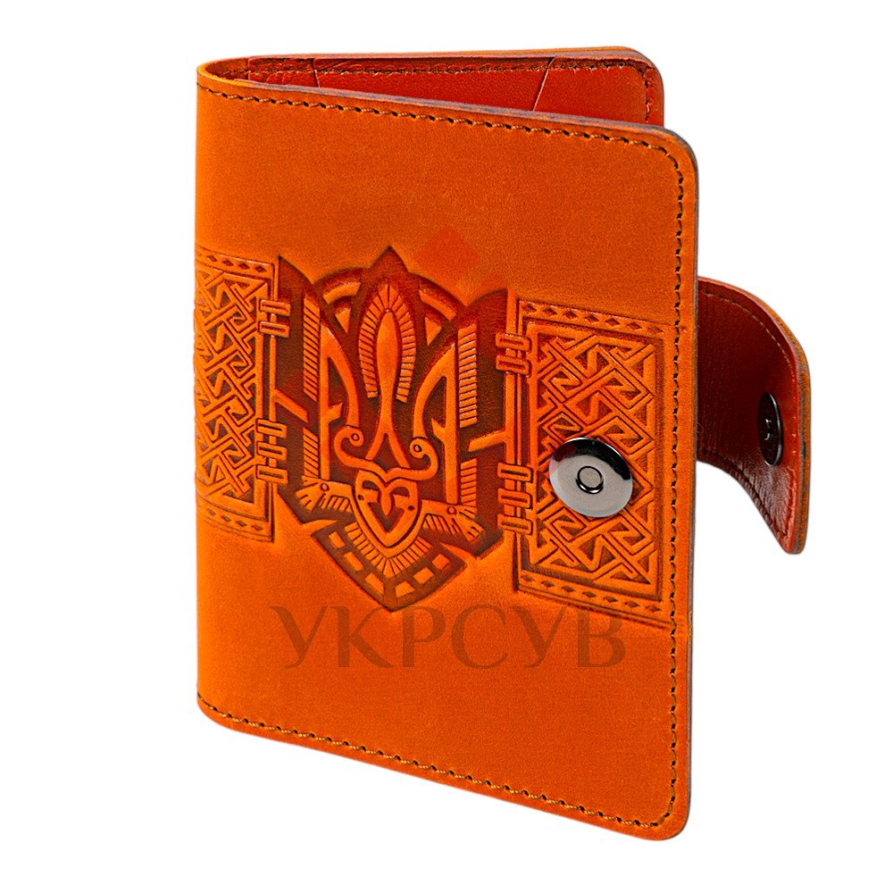Обкладинка для документів "Тризуб", помаранчевийСтильна обкладинка для документів із виразним тисненням у вигляді Тризуба — символу сили, свободи та української ідентичності. Орнаментальні елементи гармонійно доповнюють композицію, створюючи глибокий і впізнаваний дизайн. Виріб виготовлений зі 100% натуральної шкіри, яка відзначається довговічністю та приємною текстурою. Завдяки продуманій конструкції обкладинка забезпечує надійний захист документів і зручне користування щодня. Функціональні внутрішні відділення дозволяють акуратно розмістити необхідні документи, а застібка на кнопці гарантує їх безпечне зберігання. Це не просто практичний аксесуар, а виразний елемент стилю з українським характером.
