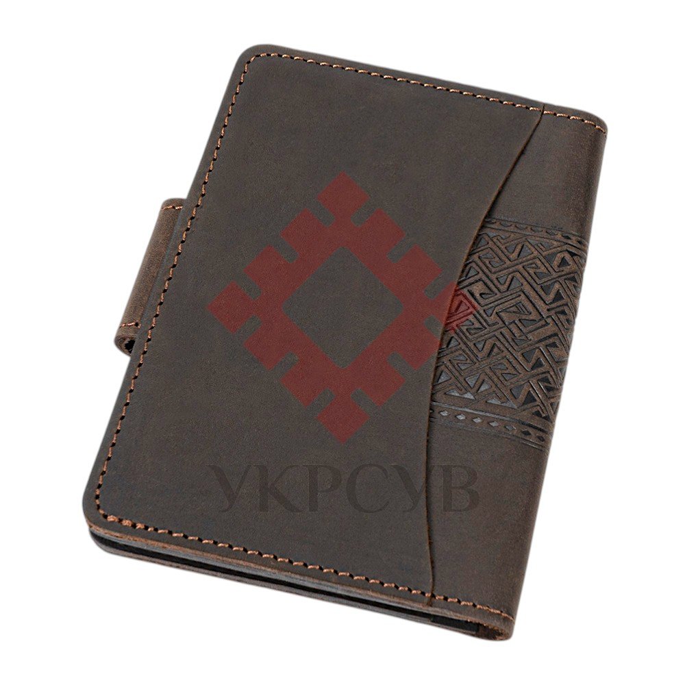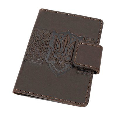 Обкладинка для документів "Тризуб", коричневийСтильна обкладинка для документів із виразним тисненням у вигляді Тризуба — символу сили, свободи та української ідентичності. Орнаментальні елементи гармонійно доповнюють композицію, створюючи глибокий і впізнаваний дизайн. Виріб виготовлений зі 100% натуральної шкіри, яка відзначається довговічністю та приємною текстурою. Завдяки продуманій конструкції обкладинка забезпечує надійний захист документів і зручне користування щодня. Функціональні внутрішні відділення дозволяють акуратно розмістити необхідні документи, а застібка на кнопці гарантує їх безпечне зберігання. Це не просто практичний аксесуар, а виразний елемент стилю з українським характером.