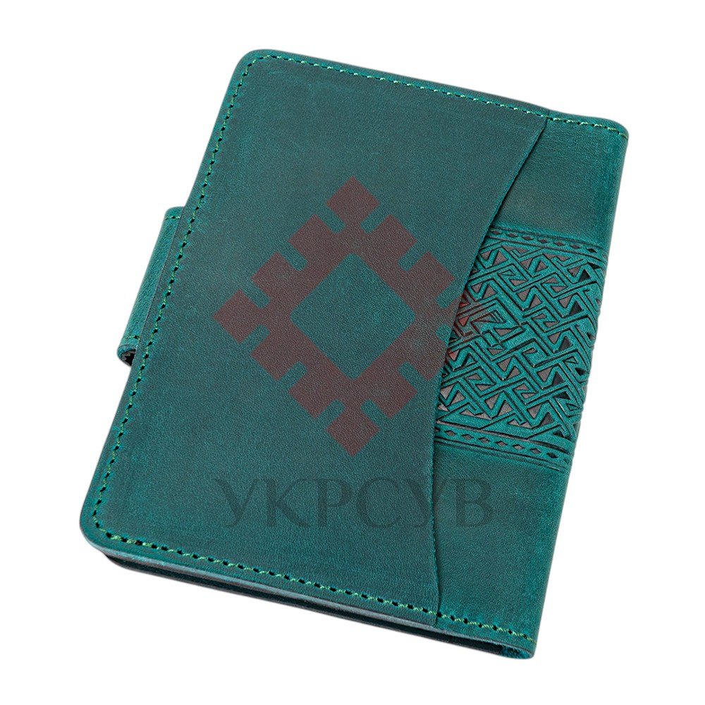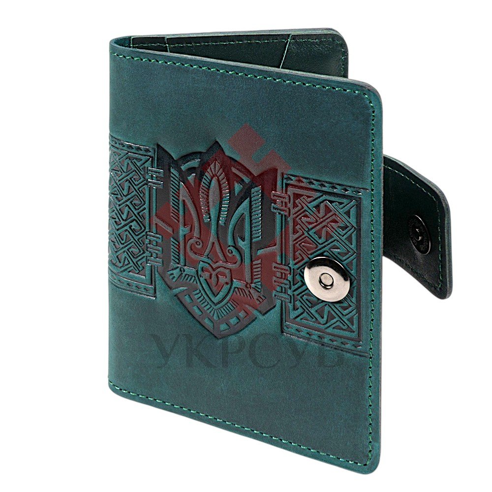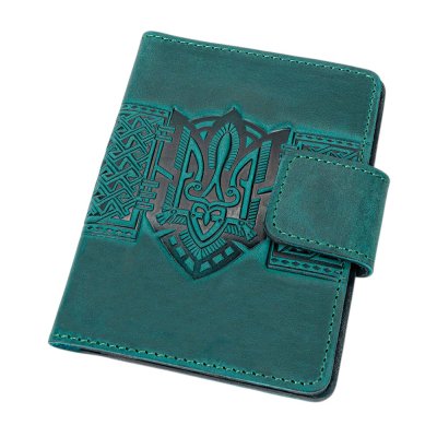 Обкладинка для документів "Тризуб", бірюзовийСтильна обкладинка для документів із виразним тисненням у вигляді Тризуба — символу сили, свободи та української ідентичності. Орнаментальні елементи гармонійно доповнюють композицію, створюючи глибокий і впізнаваний дизайн. Виріб виготовлений зі 100% натуральної шкіри, яка відзначається довговічністю та приємною текстурою. Завдяки продуманій конструкції обкладинка забезпечує надійний захист документів і зручне користування щодня. Функціональні внутрішні відділення дозволяють акуратно розмістити необхідні документи, а застібка на кнопці гарантує їх безпечне зберігання. Це не просто практичний аксесуар, а виразний елемент стилю з українським характером.